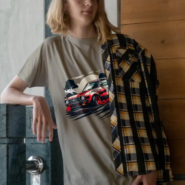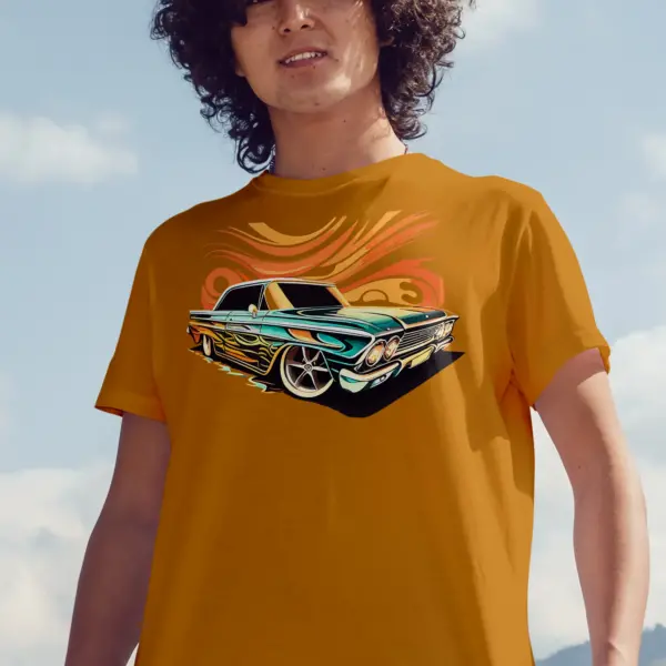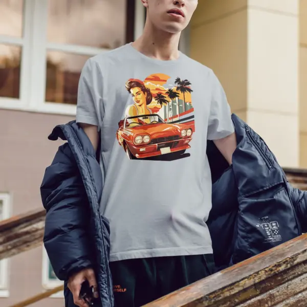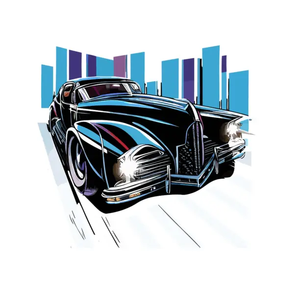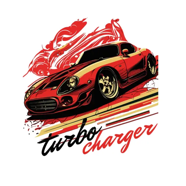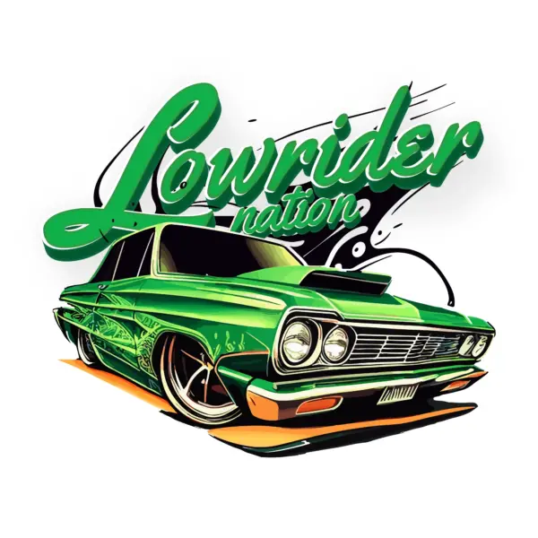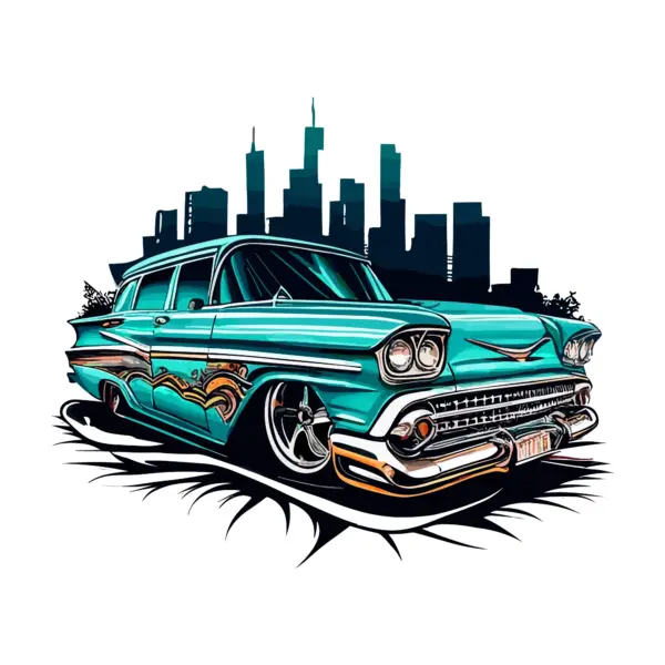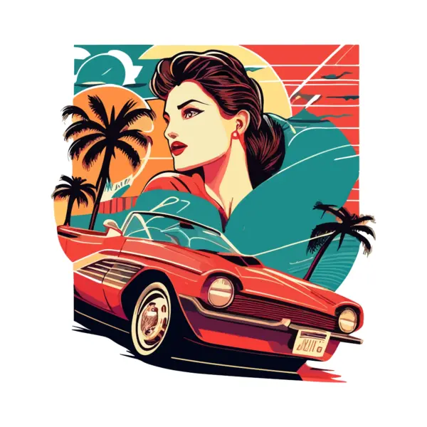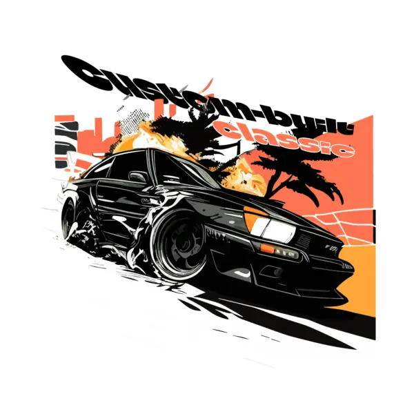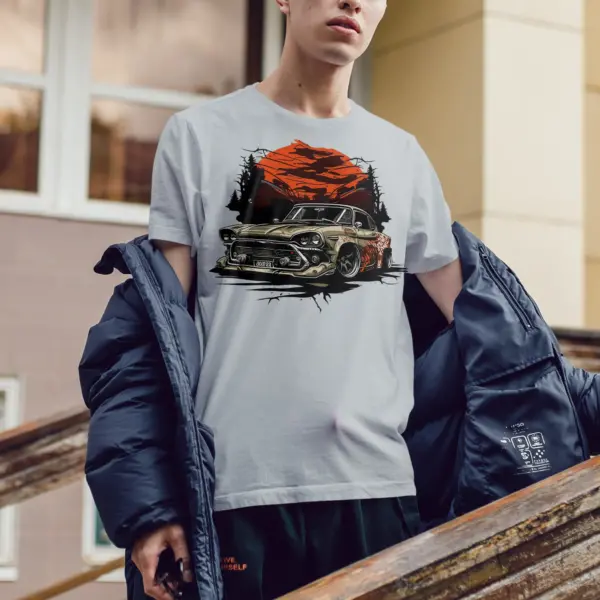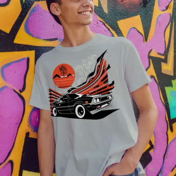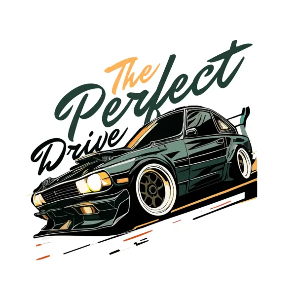 Iconic muscle car with sunset and mountains in the background with power phrase design