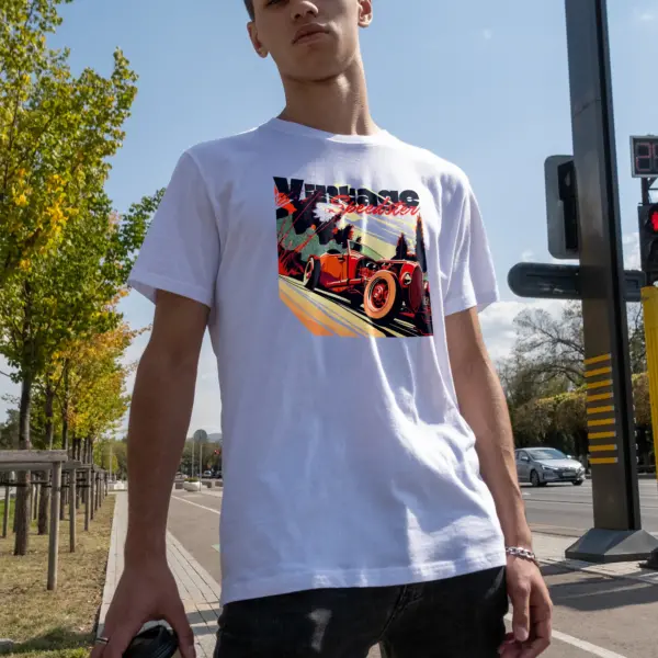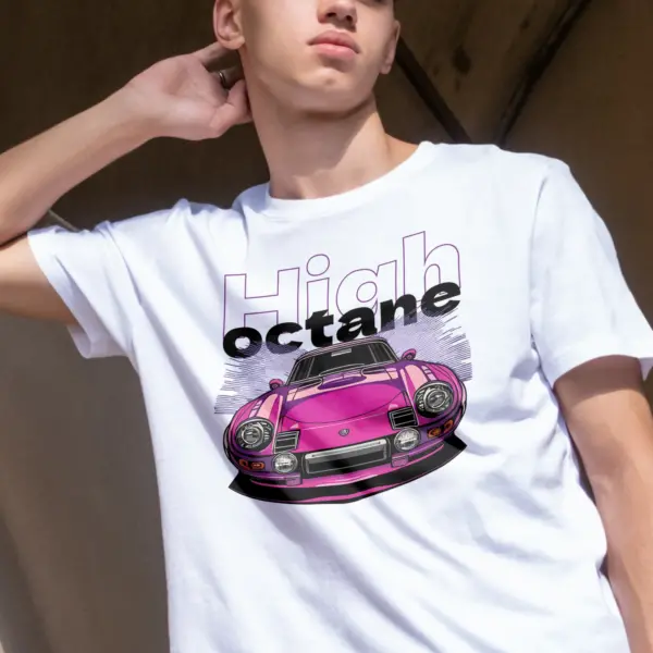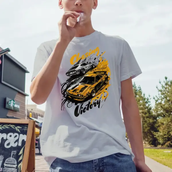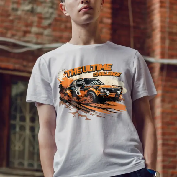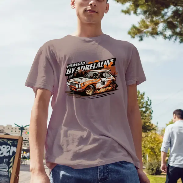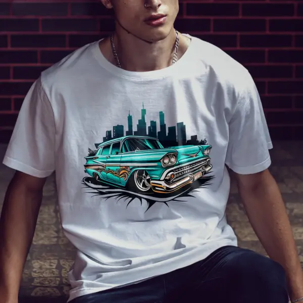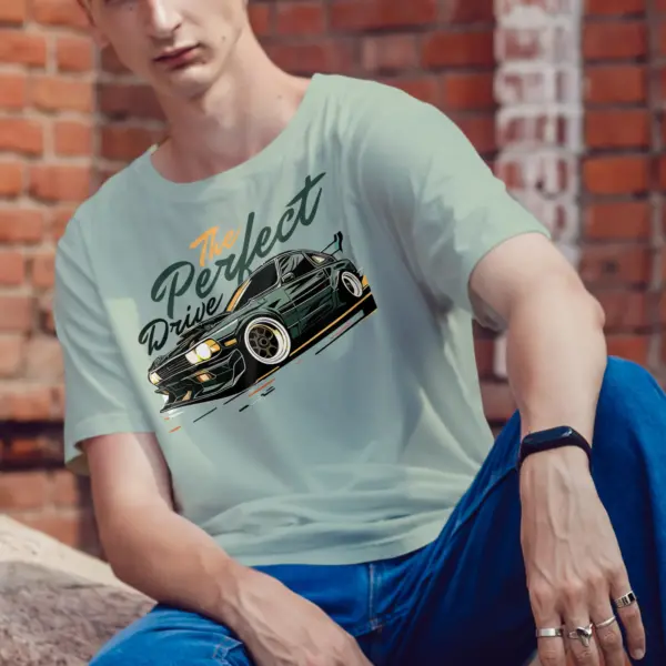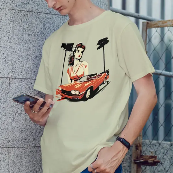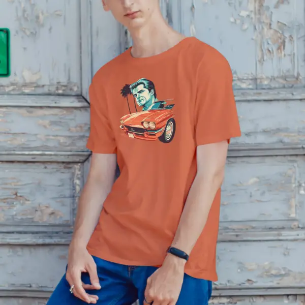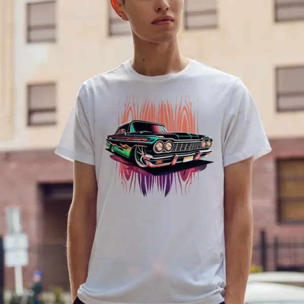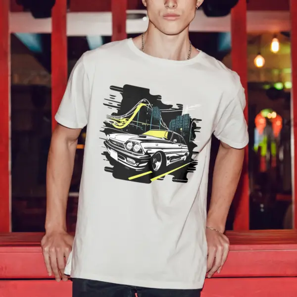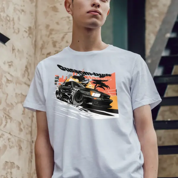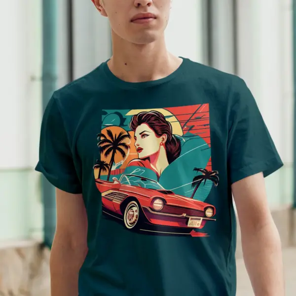 Iconic muscle car with sunset and mountains in the background with power phrase design