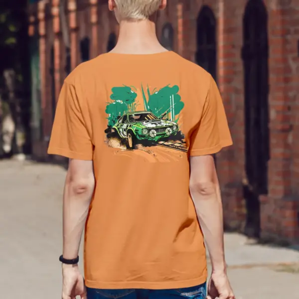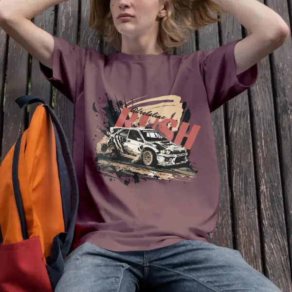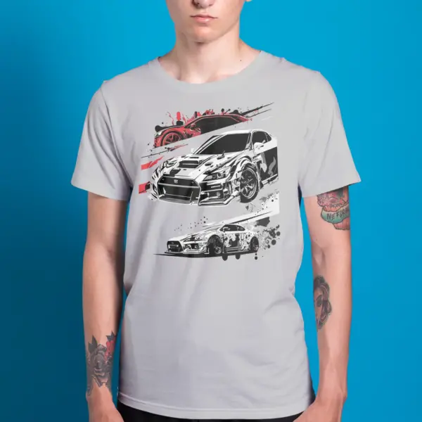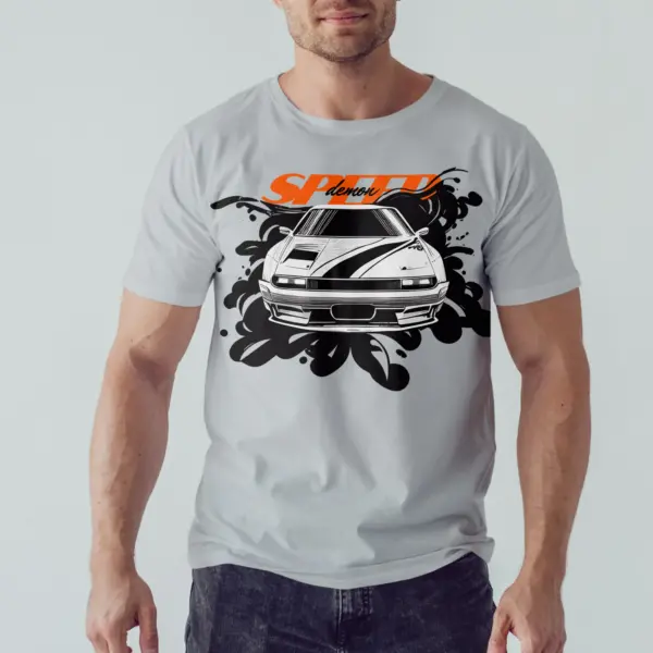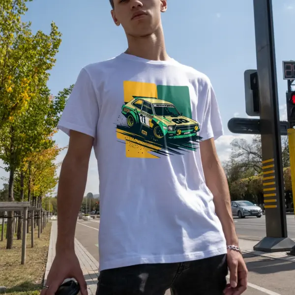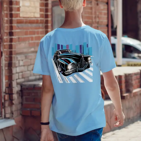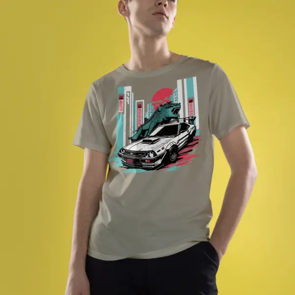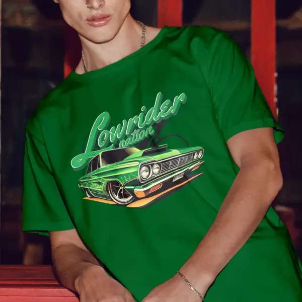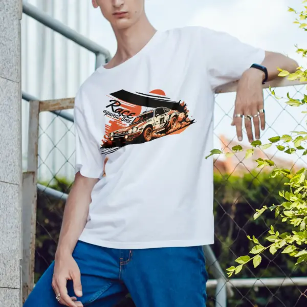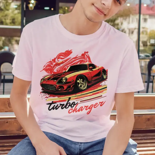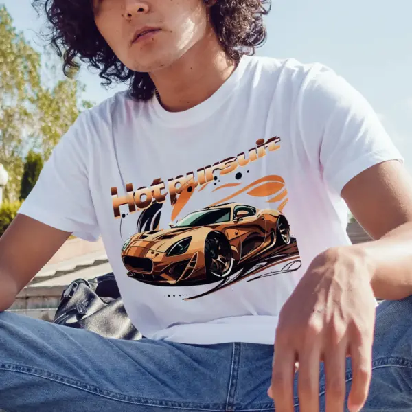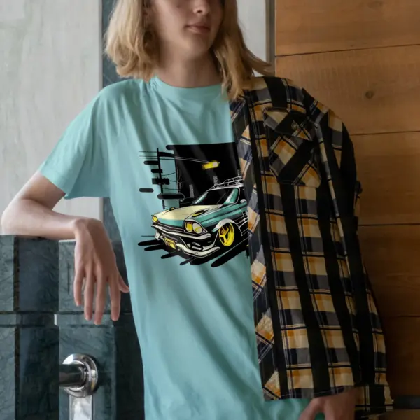 Iconic muscle car with sunset and mountains in the background with power phrase design