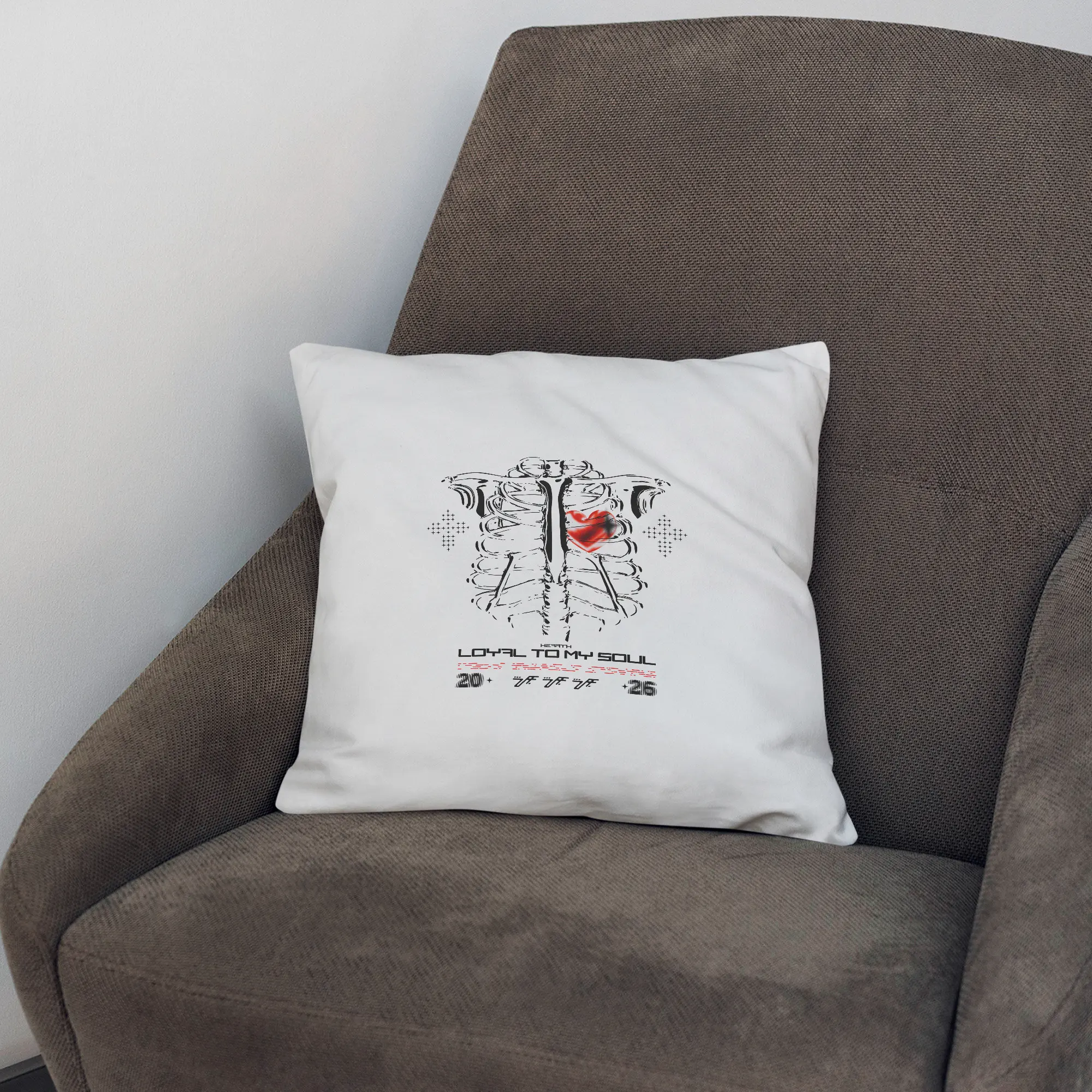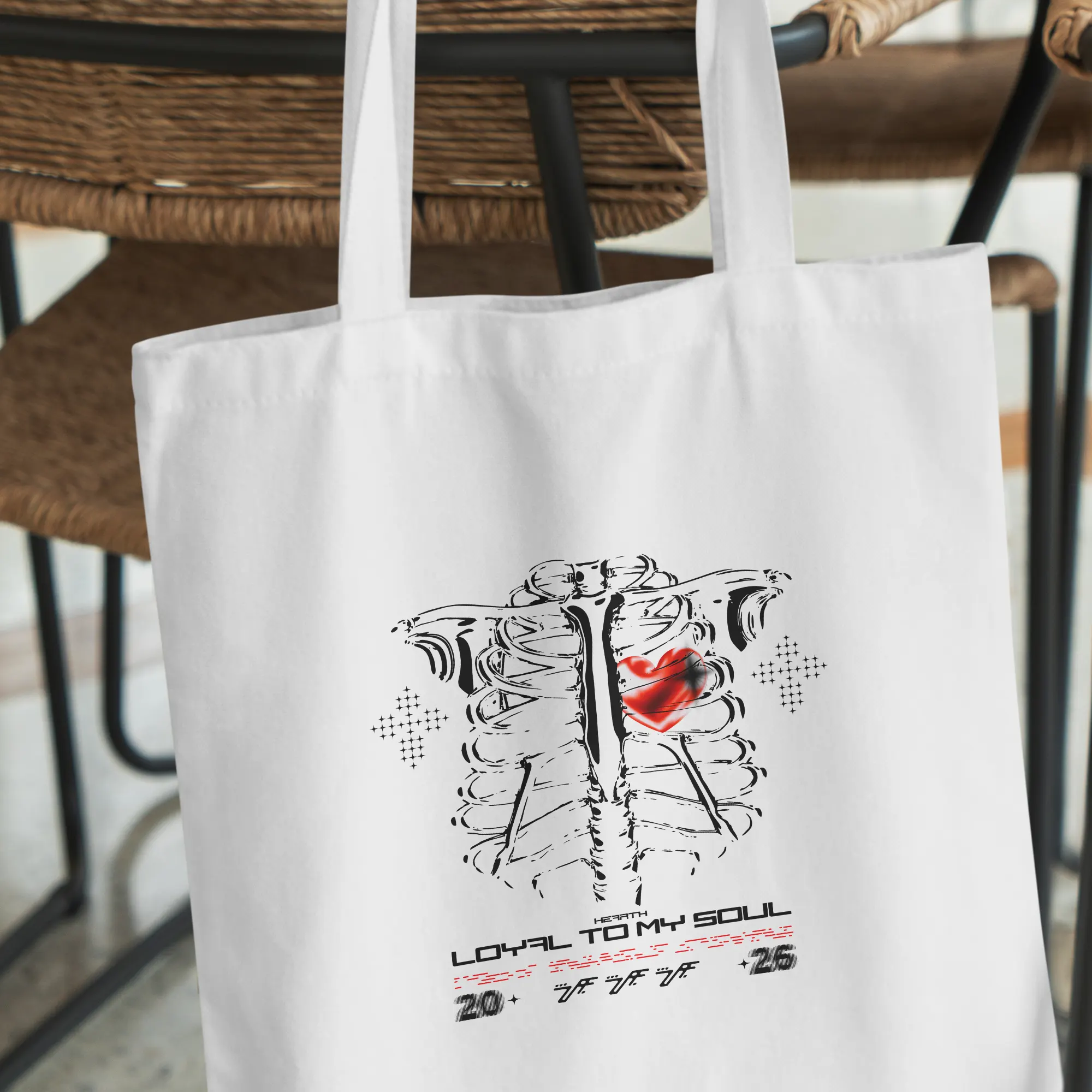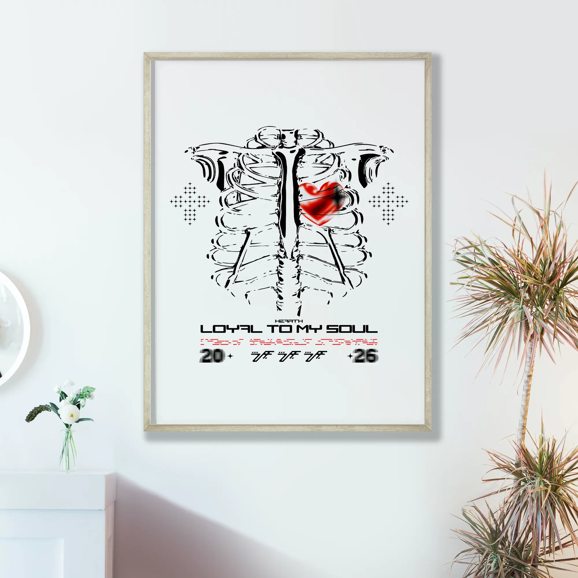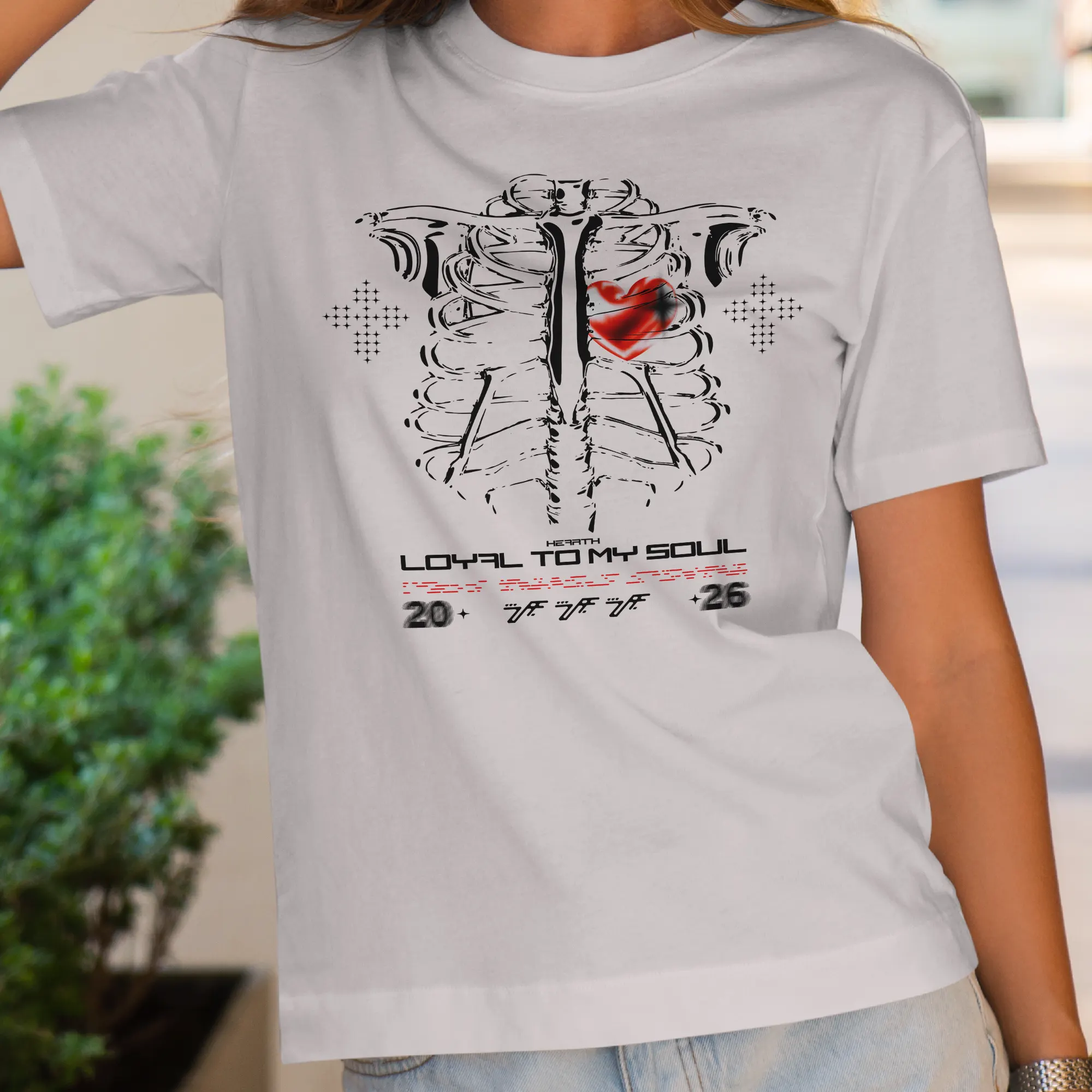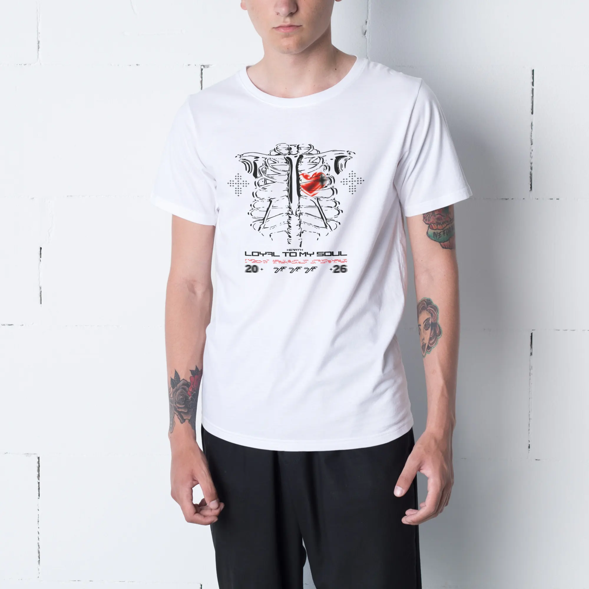 This vertical print design shows an expressive anatomical ribcage centered on the page with a vivid red, slightly smudged heart positioned over the left ribs, flanked by halftone cross motifs and typographic elements including the headline “LOYAL TO MY SOUL” plus small numeric and glyph accents; the artwork mixes hand-drawn, brush-like ink strokes for the bones with a bold script/techno display for the wordmark. The three primary colors are black (linework and text), white (background) and saturated red (heart highlight). Visual effects include distressed ink strokes, halftone dot patterns and a soft radial smudge on the heart, while the composition remains flat (no 3D shadows or gradients). Overall the piece reads as modern, urban and tattoo-influenced—a streetwear-ready illustrated poster in a vertical layout ideal for prints or apparel.