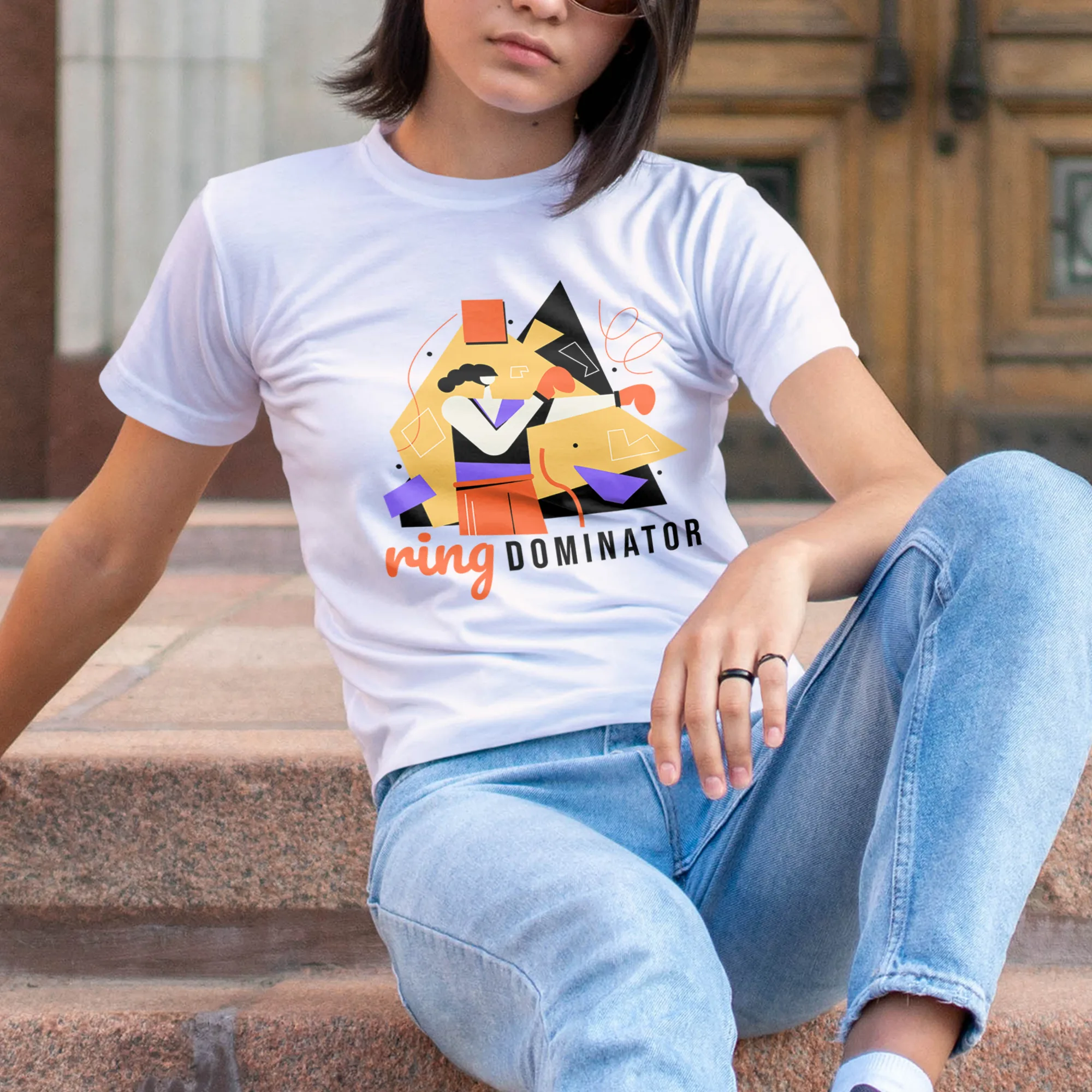 The design features a teenage boy training boxing in a bold and colorful style, incorporating geometric shapes and illustrated elements. The design is primarily in black with pops of orange and purple. The text, "Ring dominator," is displayed prominently in a mix of sans serif and script fonts. This design is perfect for any sports enthusiast looking to make a statement.