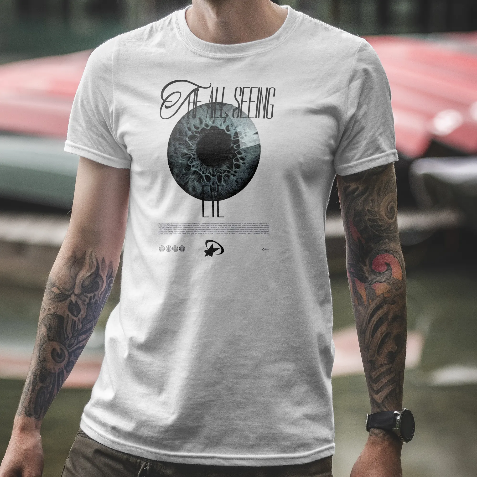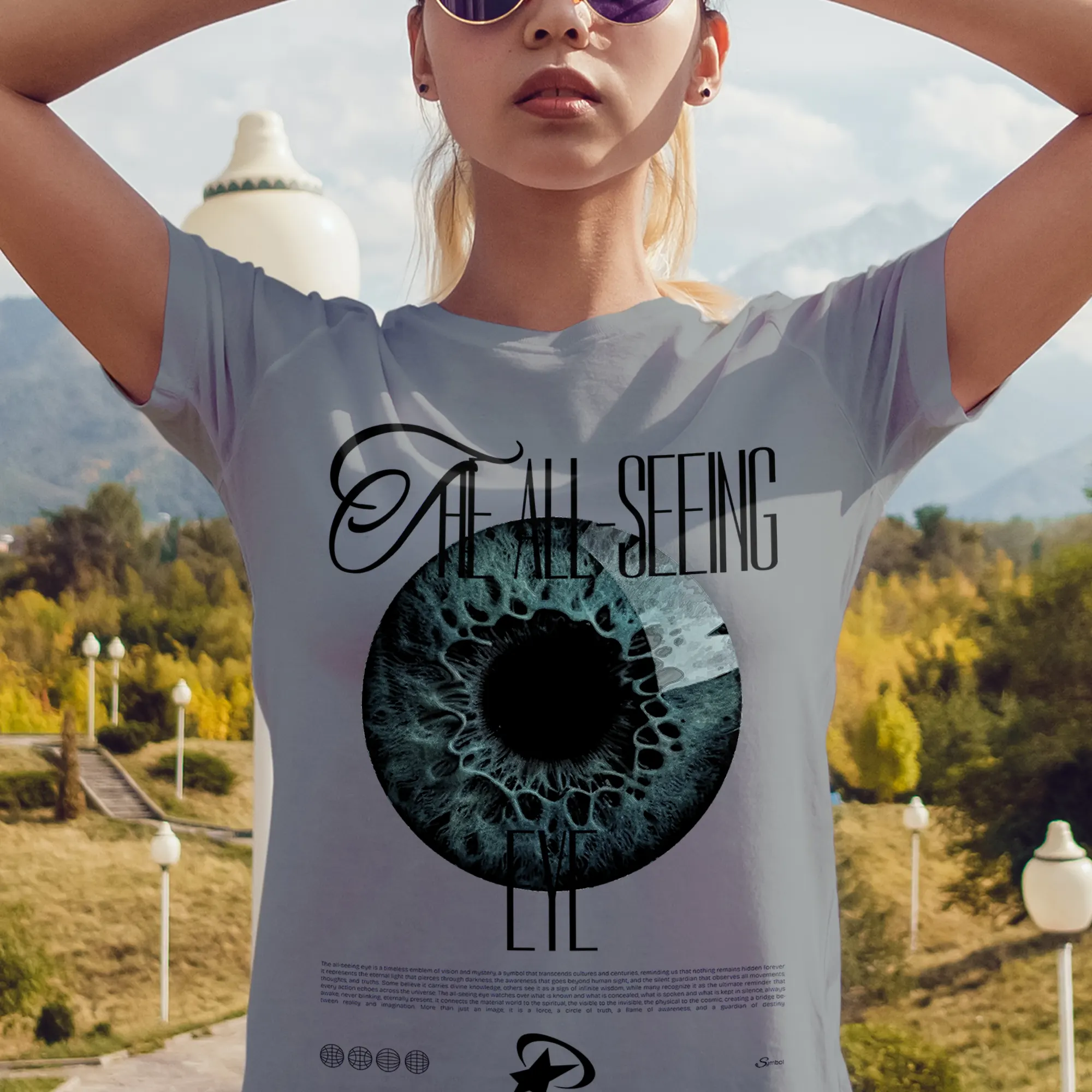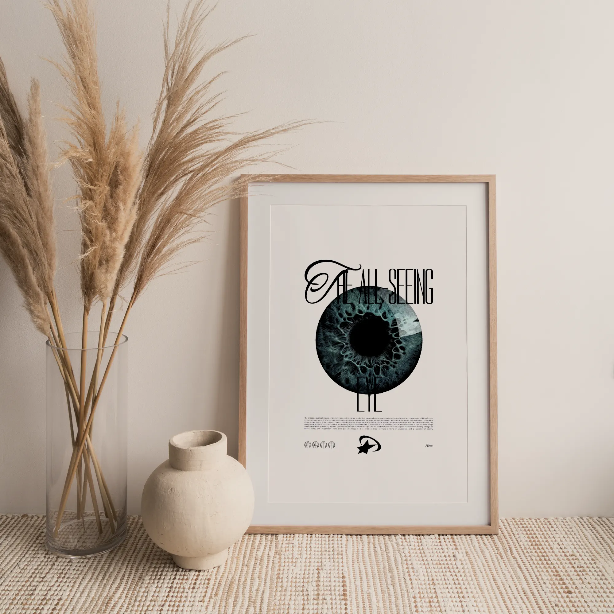 This is a vertical, deep modern graphic design centered around the powerful image of an eye with an intensely detailed iris, giving the impression of an "All-Seeing Eye." The main text features the phrase "THE ALL-SEEING EYE" rendered in two distinct typography styles: a fluid, elegant script font for "The" and a clean, capitalized serif font for "ALL-SEEING EYE." The three main colors are a deep Blue/Cyan in the iris and accent text, Black for the surrounding text and elements, and White for the background. The design includes subtle glitch-like or abstract effects within the iris and a high-contrast aesthetic, giving it a professional, enigmatic look.
