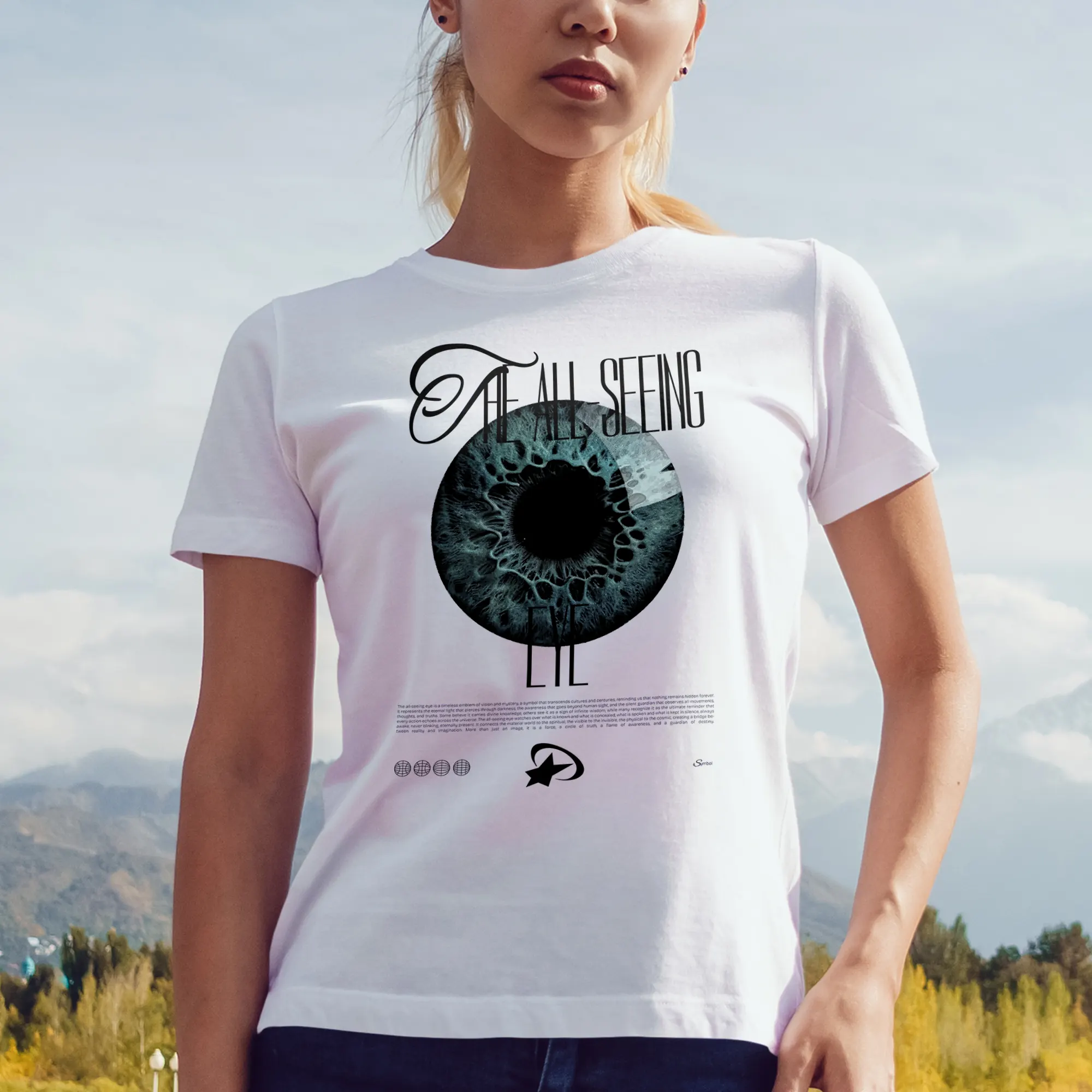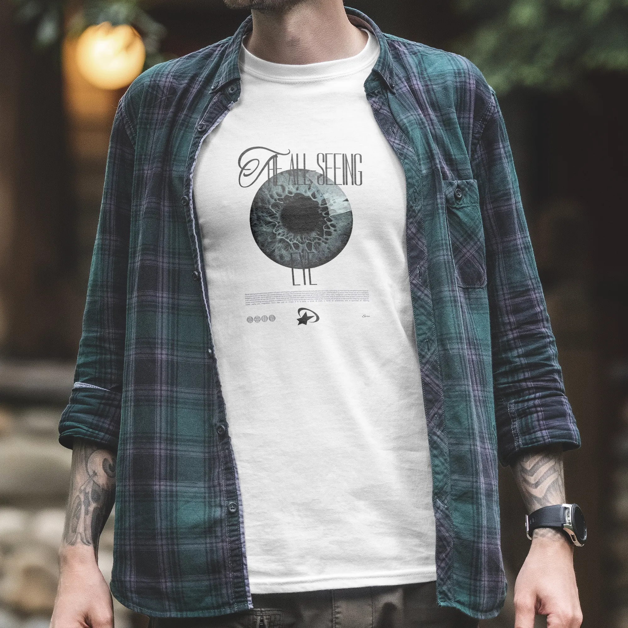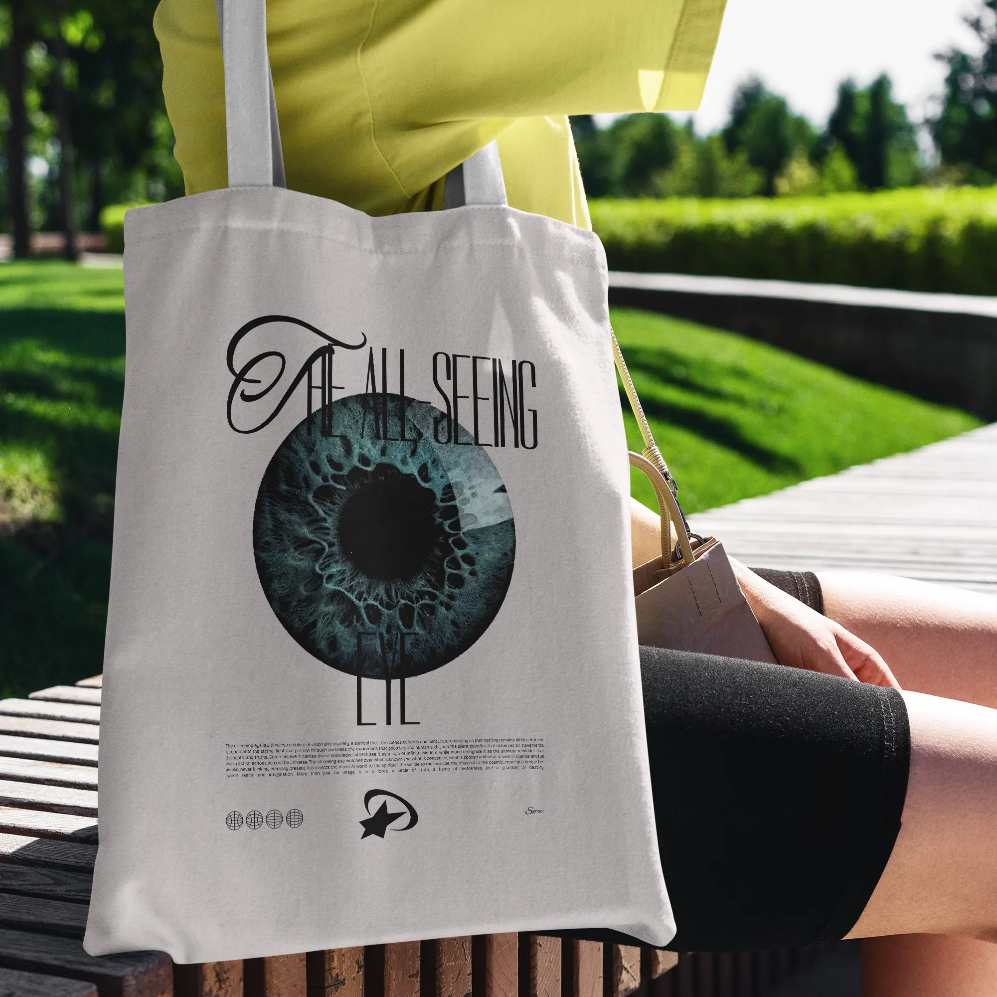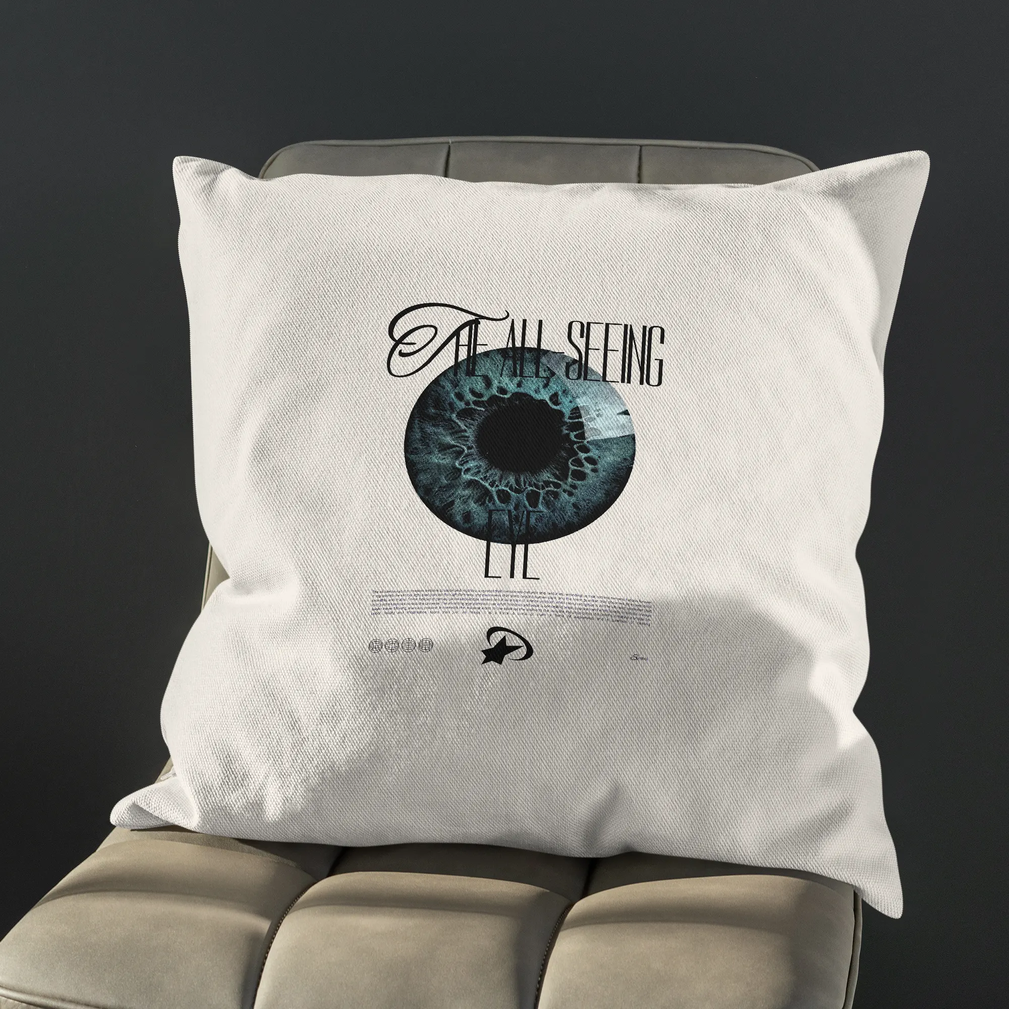 This is a vertical, deep modern graphic design centered around the powerful image of an eye with an intensely detailed iris, giving the impression of an "All-Seeing Eye." The main text features the phrase "THE ALL-SEEING EYE" rendered in two distinct typography styles: a fluid, elegant script font for "The" and a clean, capitalized serif font for "ALL-SEEING EYE." The three main colors are a deep Blue/Cyan in the iris and accent text, Black for the surrounding text and elements, and White for the background. The design includes subtle glitch-like or abstract effects within the iris and a high-contrast aesthetic, giving it a professional, enigmatic look.