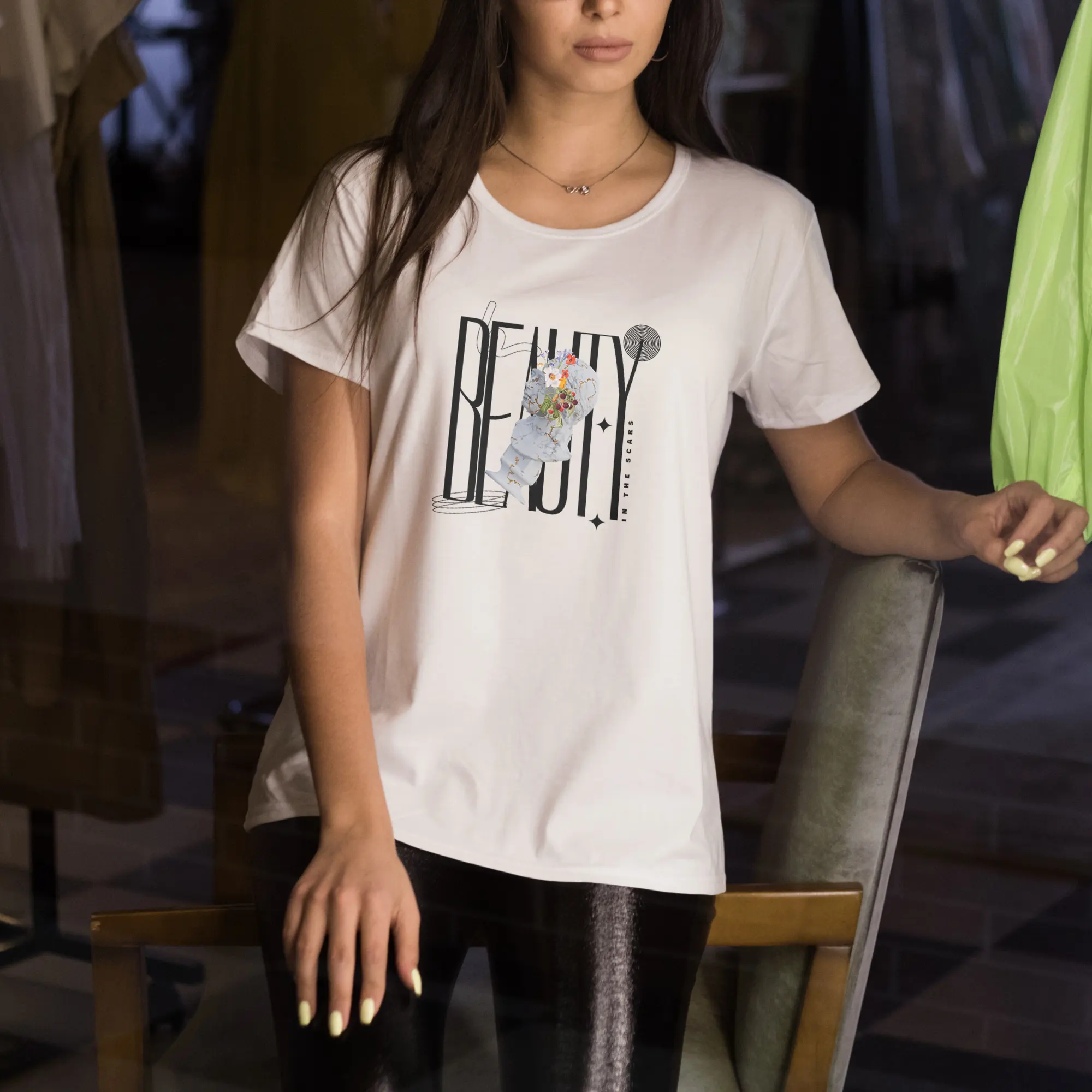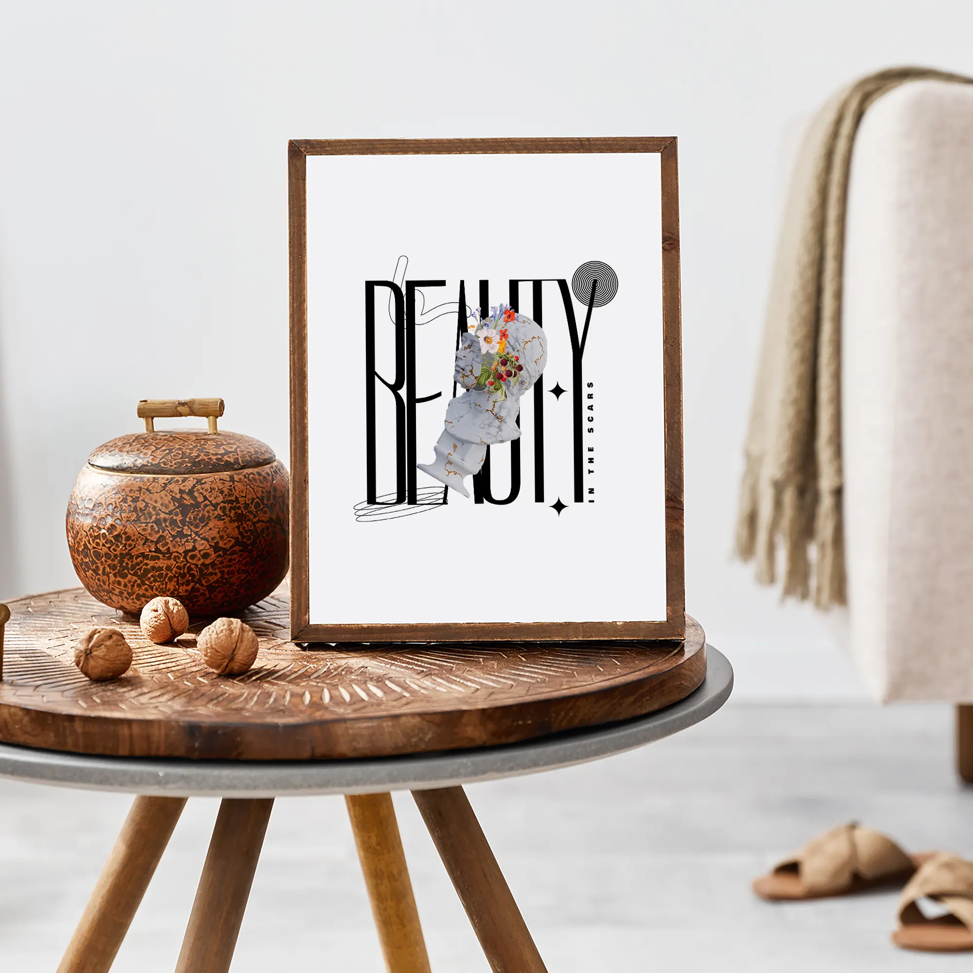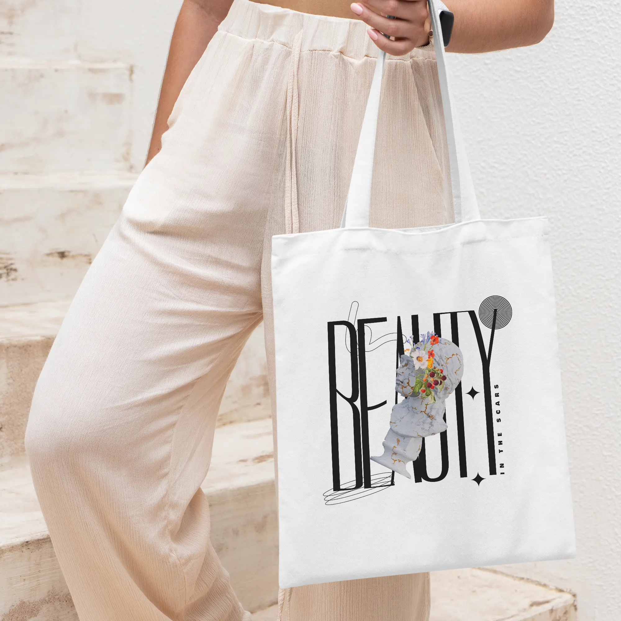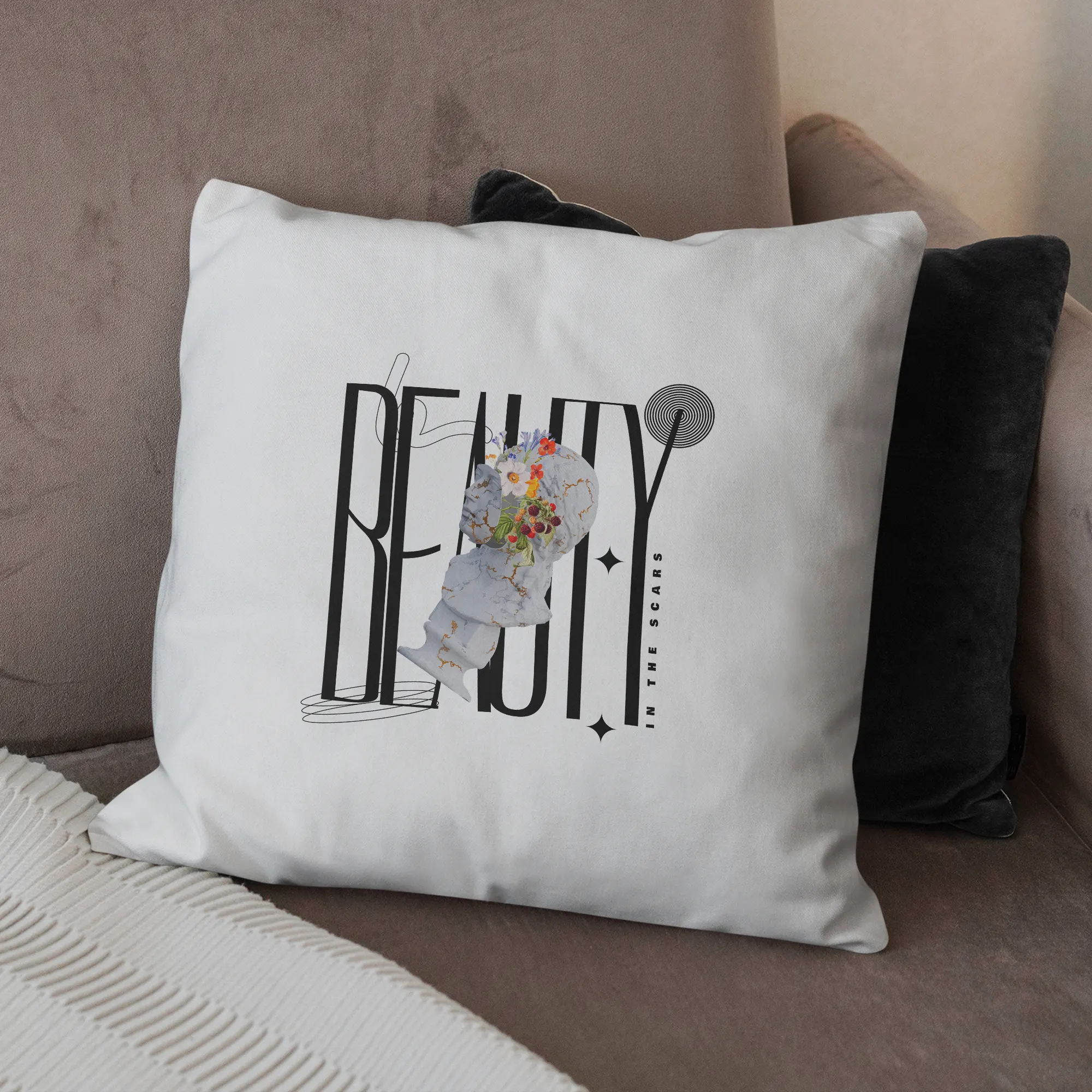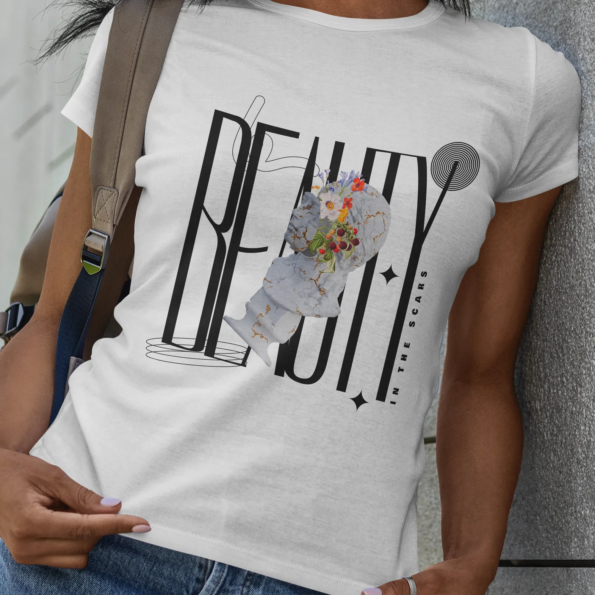 The design features a vertically oriented composition with a surreal and contemporary style, centered around a white marble sculpture with golden cracks, inspired by the Japanese art of kintsugi, which finds beauty in repair. From the fractures of the head emerge vivid flowers and red fruits, symbolizing life, renewal, and inner beauty. Behind the sculpture, the tall and slender black typography spells “BEAUTY”, accompanied by the phrase “IN THE SCARS” placed vertically on the right side, emphasizing the poetic essence of the piece. The three dominant colors are the marble white of the sculpture, the deep black of the typography, and the vibrant tones of the flowers and fruits (orange, red, and green), creating a harmonious contrast between the classical and the modern, the broken and the blossoming.