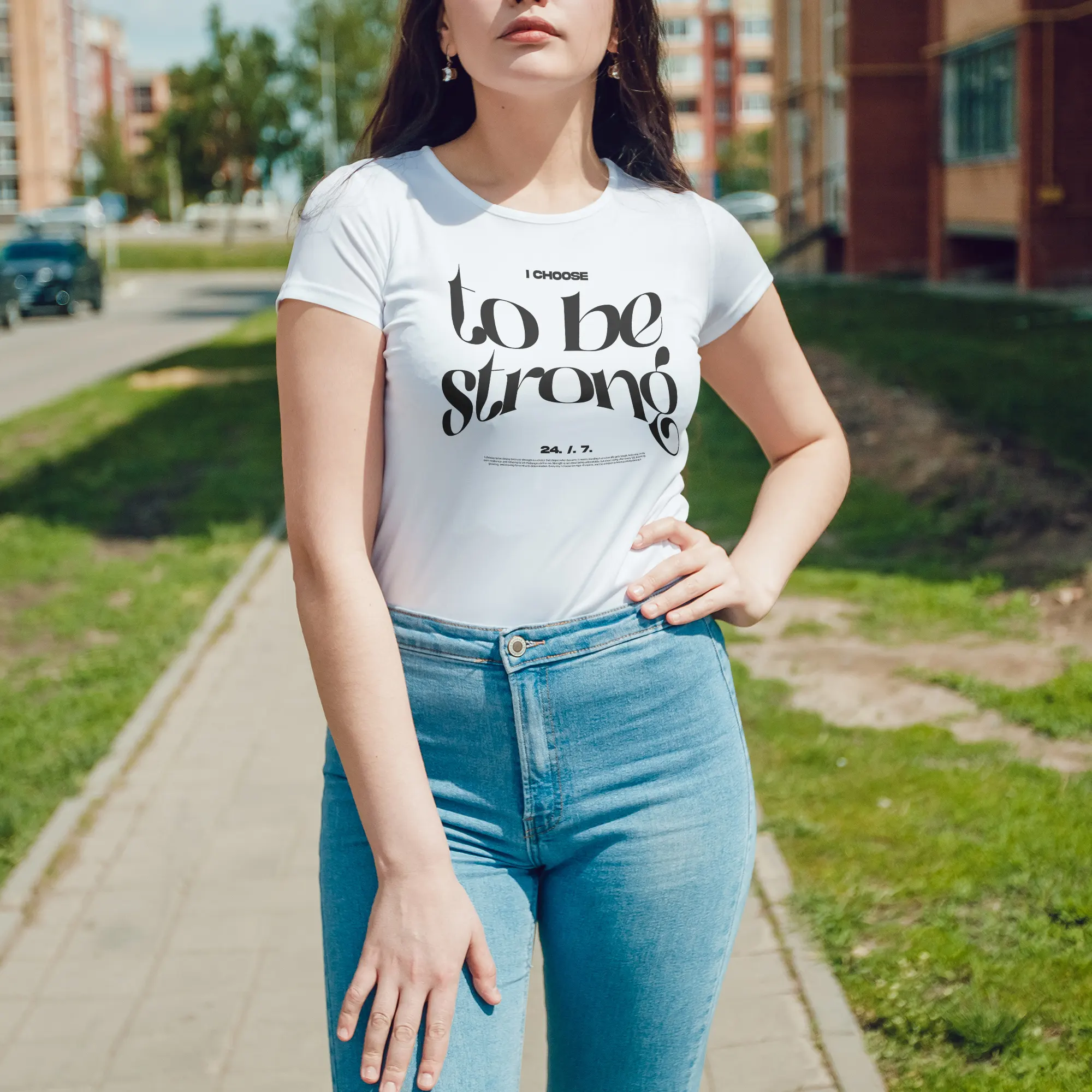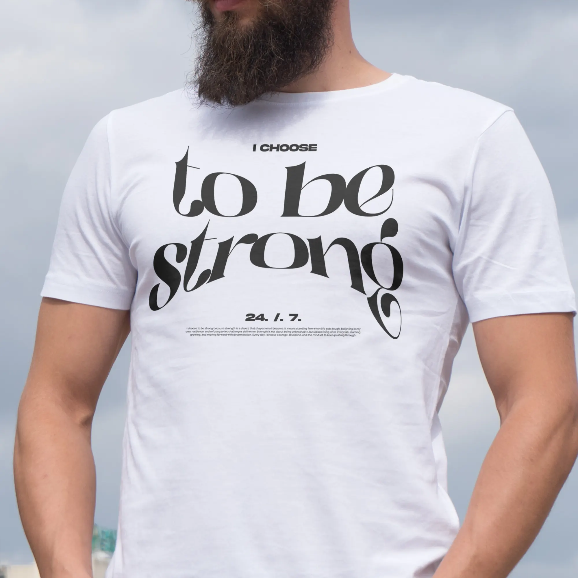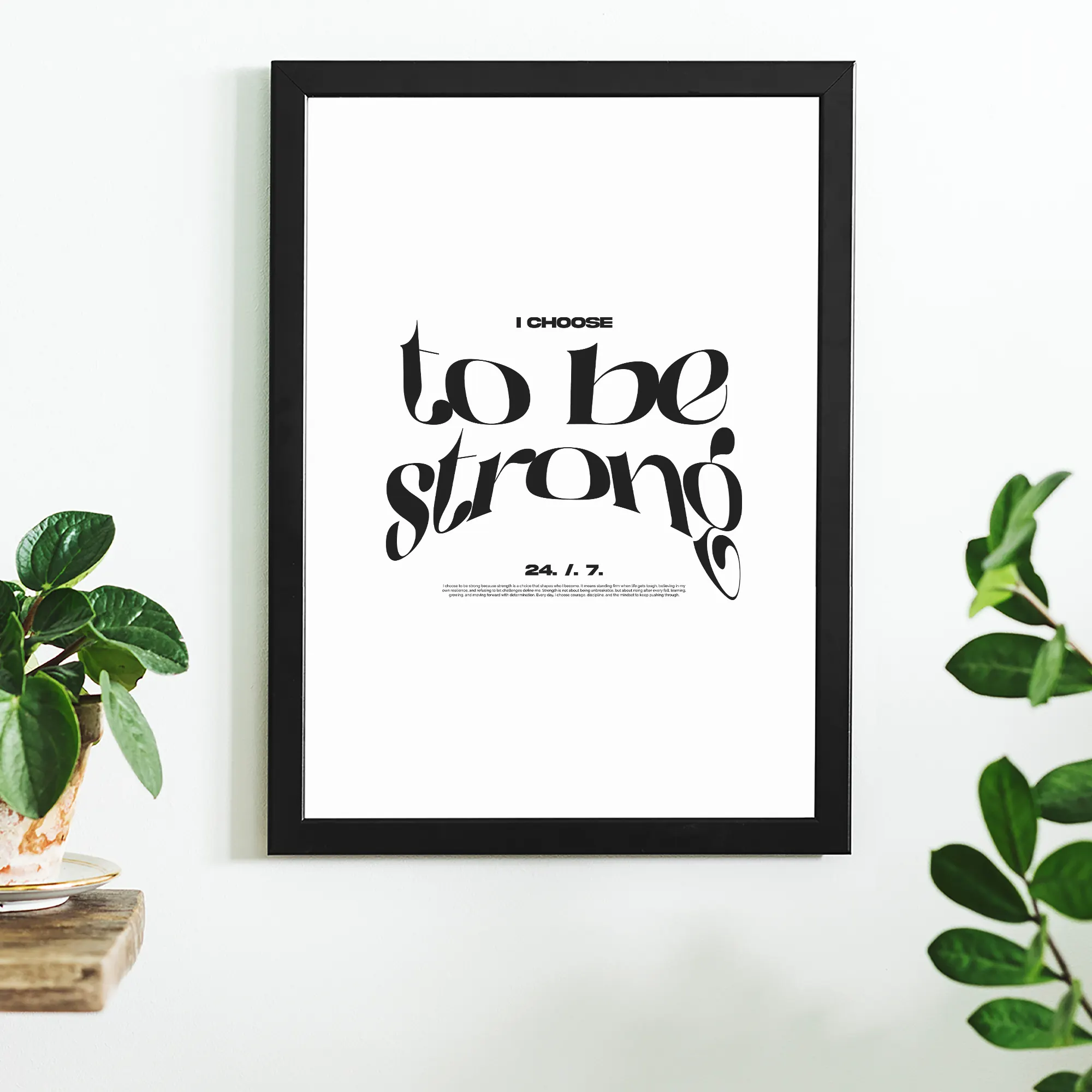 This print-ready poster features a bold typographic statement — “I CHOOSE / to be strong” — set in a large ornamental serif with dramatic contrast and calligraphic curves, complemented by small sans-serif microcopy and the date marker “24./.7.” The palette is restrained: pale cream (main headline), charcoal black (background and small text), and light gray (subtle highlights), producing a refined high-contrast look. Visual treatment relies on scale contrast, elegant ligatures, and clean flat fills with no additional textures or shadows, giving the piece a modern, editorial and fashion-oriented aesthetic; the composition is horizontally centered within a vertical poster format ideal for print.