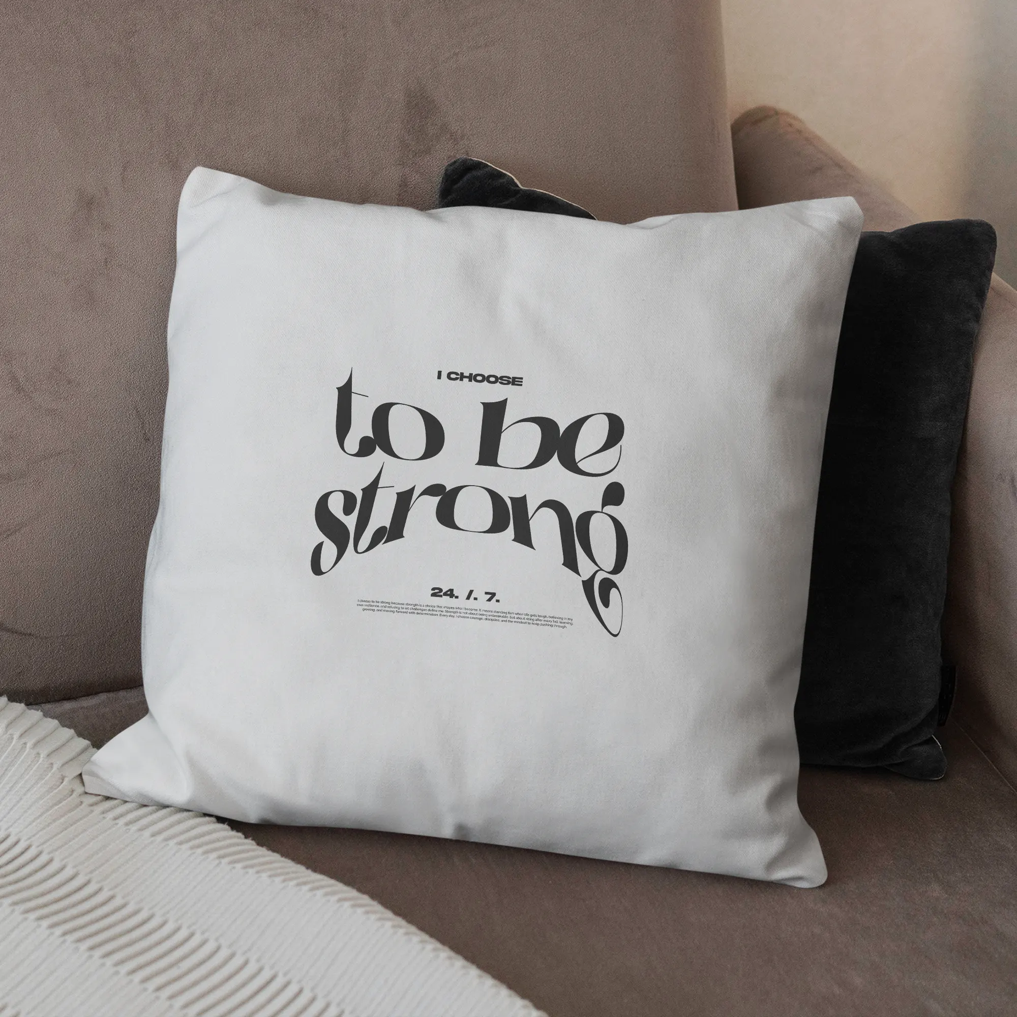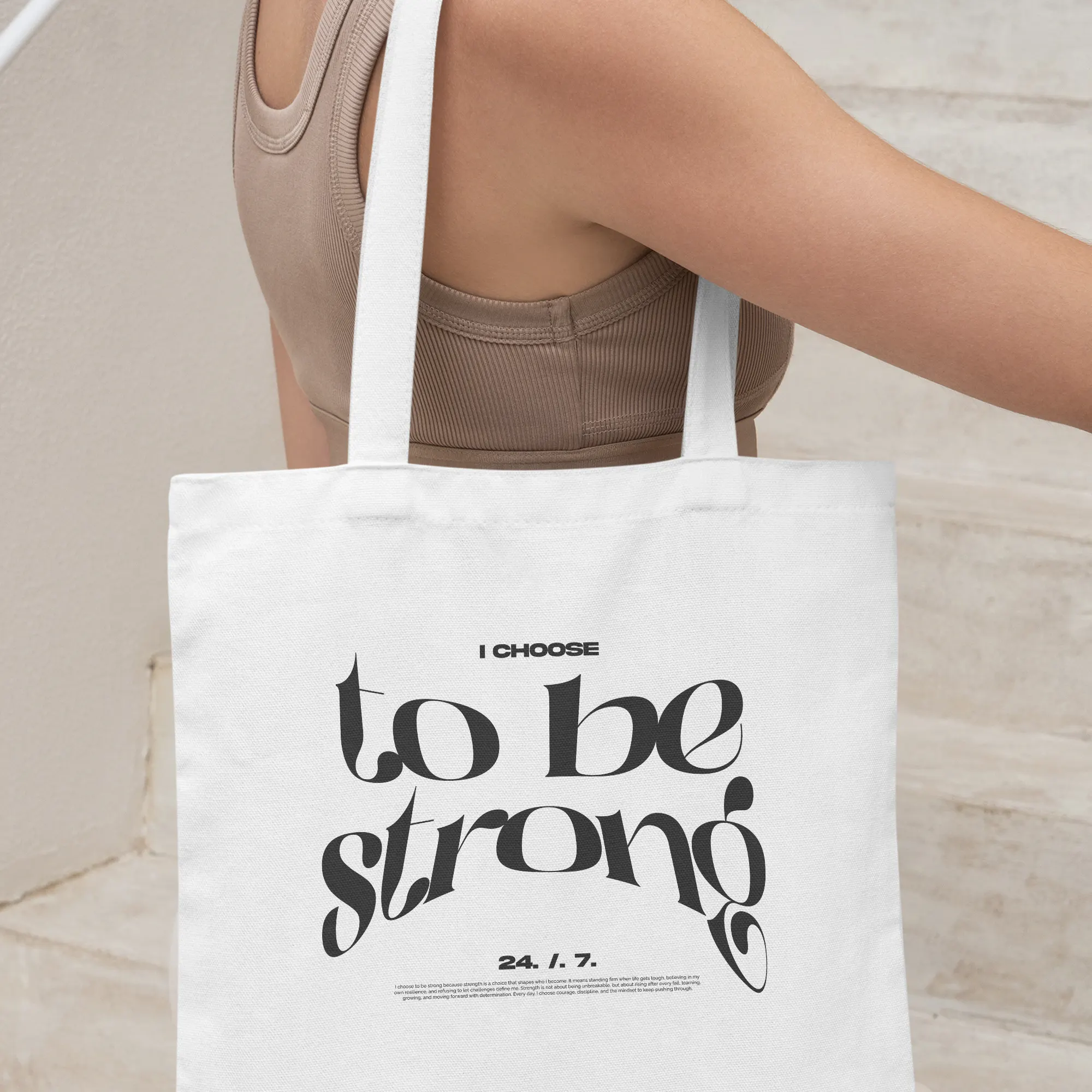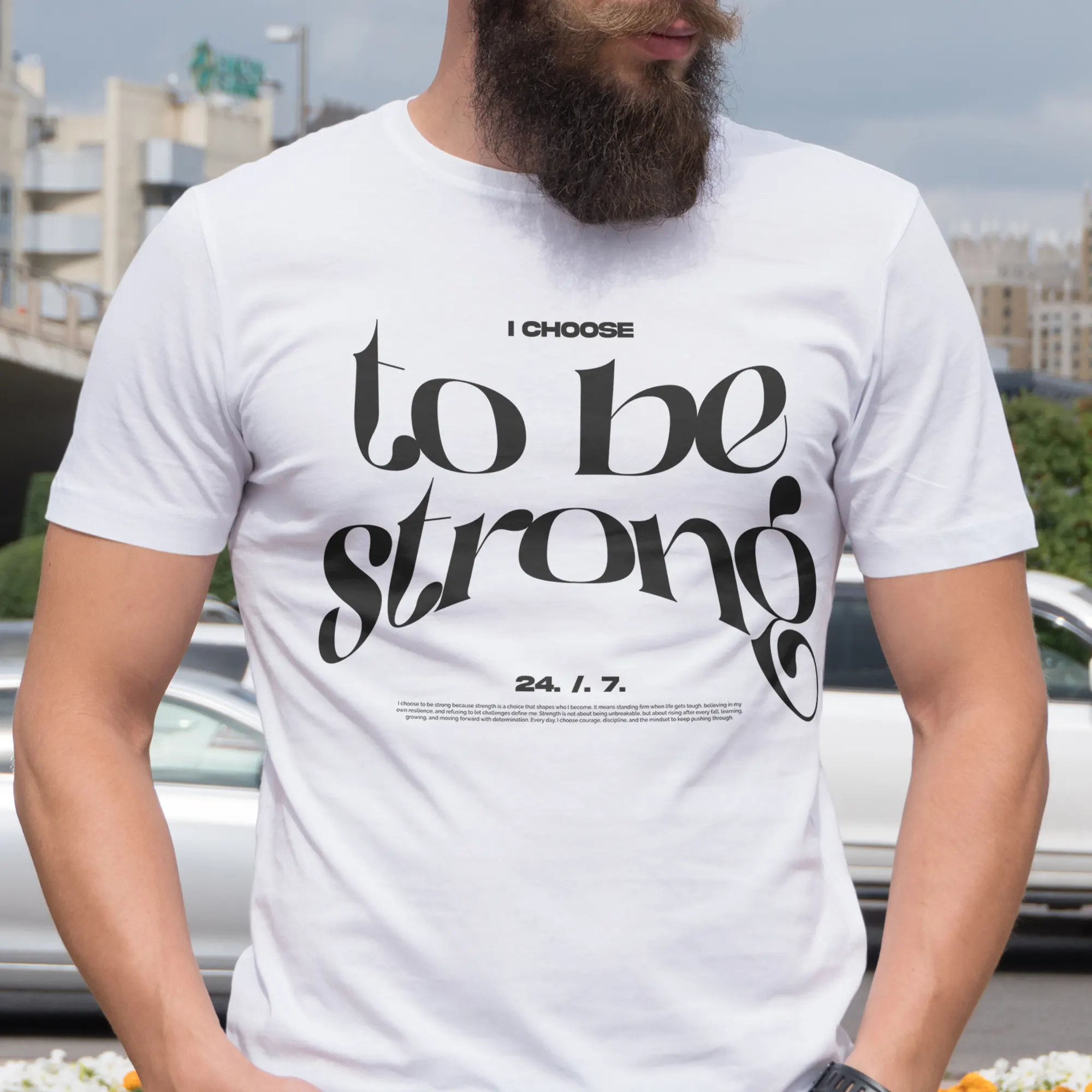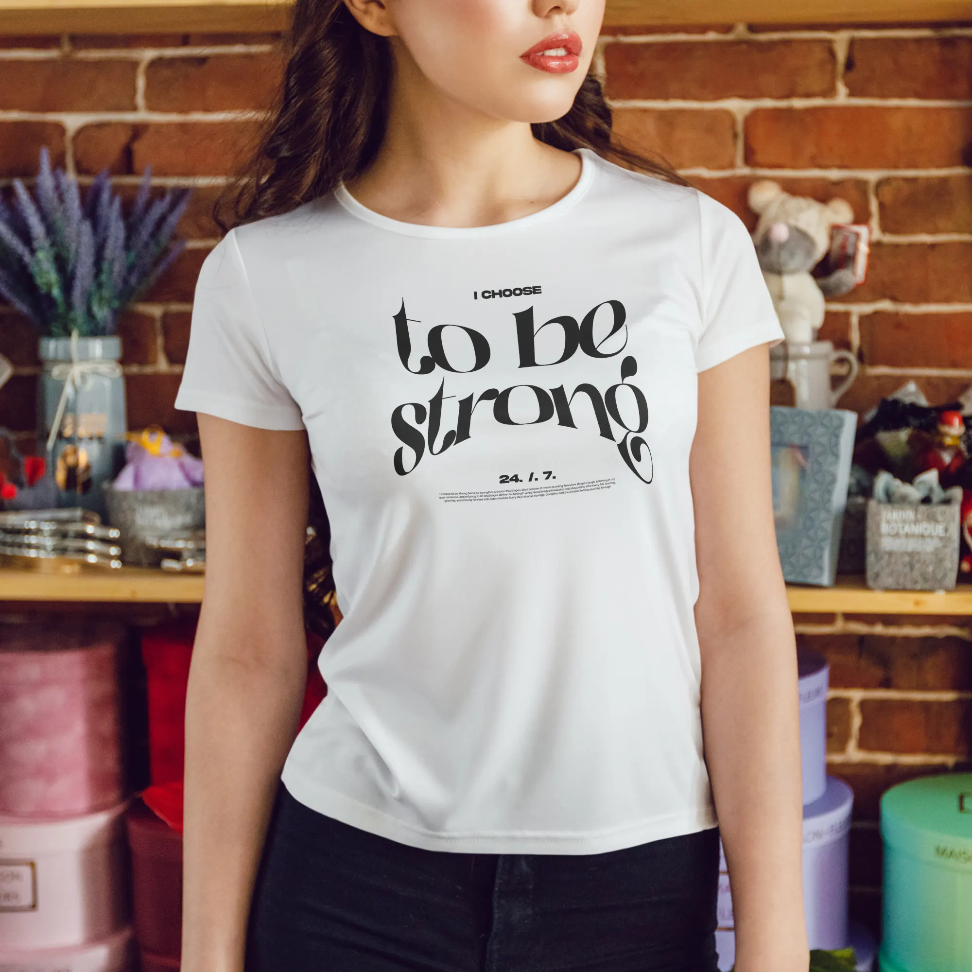 This print-ready poster features a bold typographic statement — “I CHOOSE / to be strong” — set in a large ornamental serif with dramatic contrast and calligraphic curves, complemented by small sans-serif microcopy and the date marker “24./.7.” The palette is restrained: pale cream (main headline), charcoal black (background and small text), and light gray (subtle highlights), producing a refined high-contrast look. Visual treatment relies on scale contrast, elegant ligatures, and clean flat fills with no additional textures or shadows, giving the piece a modern, editorial and fashion-oriented aesthetic; the composition is horizontally centered within a vertical poster format ideal for print.