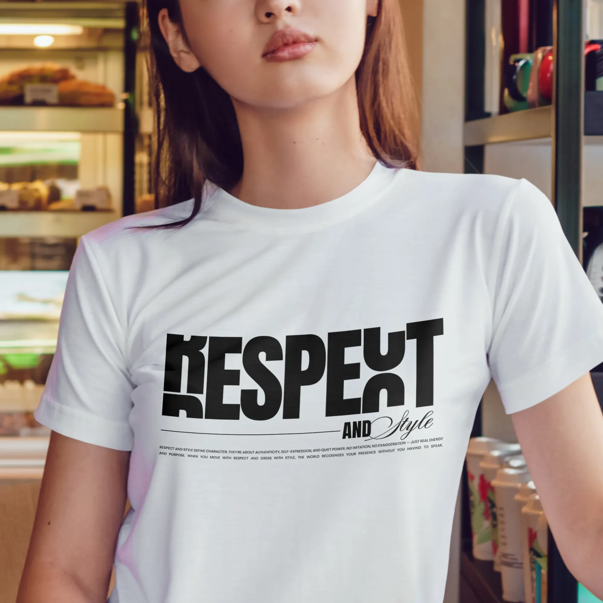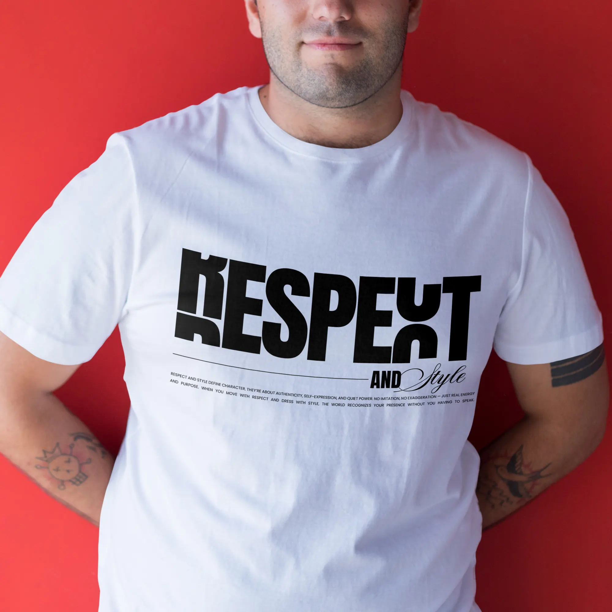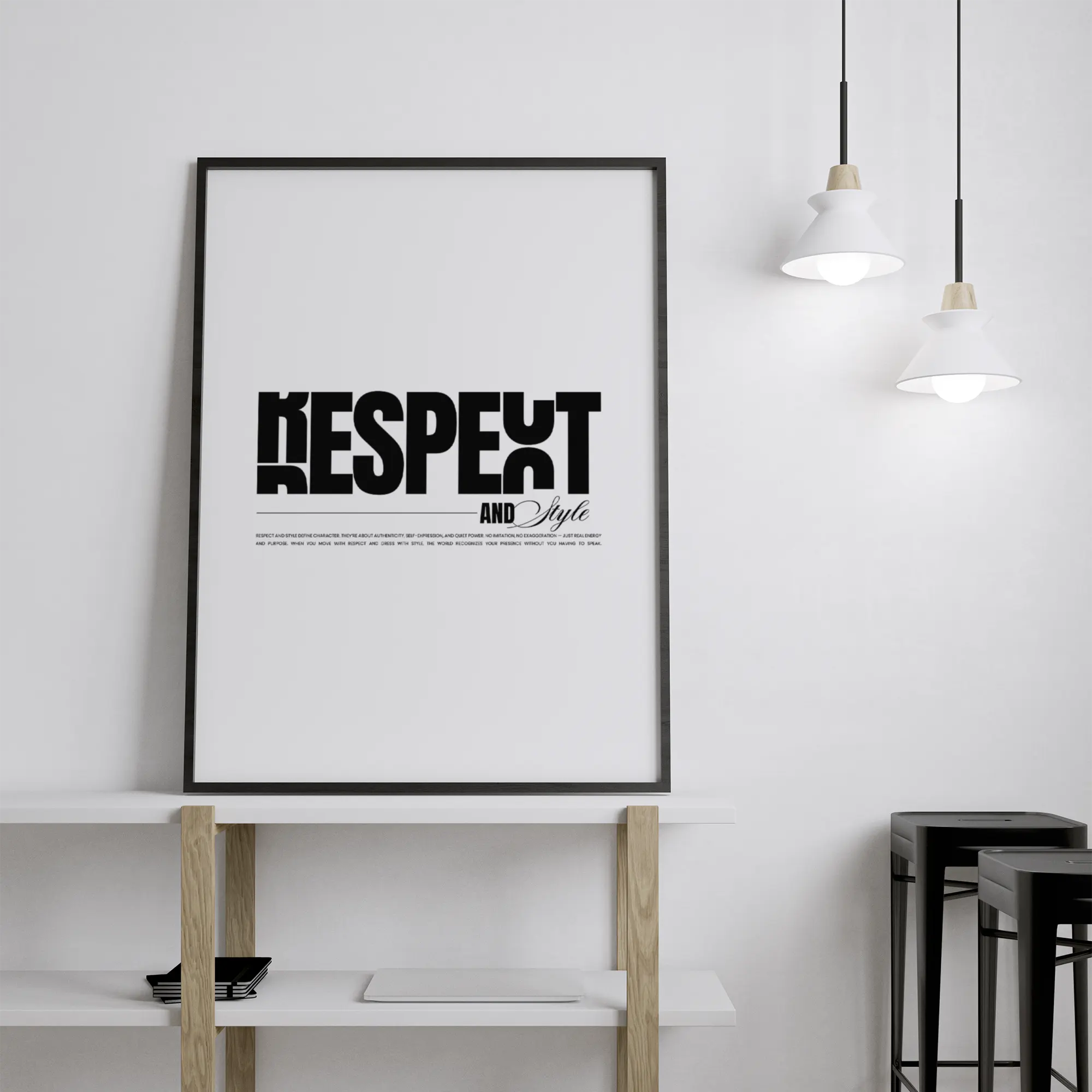 This is a vertical, clean minimalist graphic design centered on the word “RESPECT” with the sub-phrase “AND Style.” The typography is the primary focus, utilizing an extremely bold, extra-condensed, and slightly distorted block font for the word “RESPECT,” dominating the upper half. The sub-phrase uses a mix of clean sans-serif and an elegant script font. The three main colors are Black for all text, a tiny section of Grey/Black for a small photo on the far right (almost entirely cropped), and White for the vast background. The overall style is modern and urban streetwear, relying on high contrast and typographic impact for a professional, statement-making print.