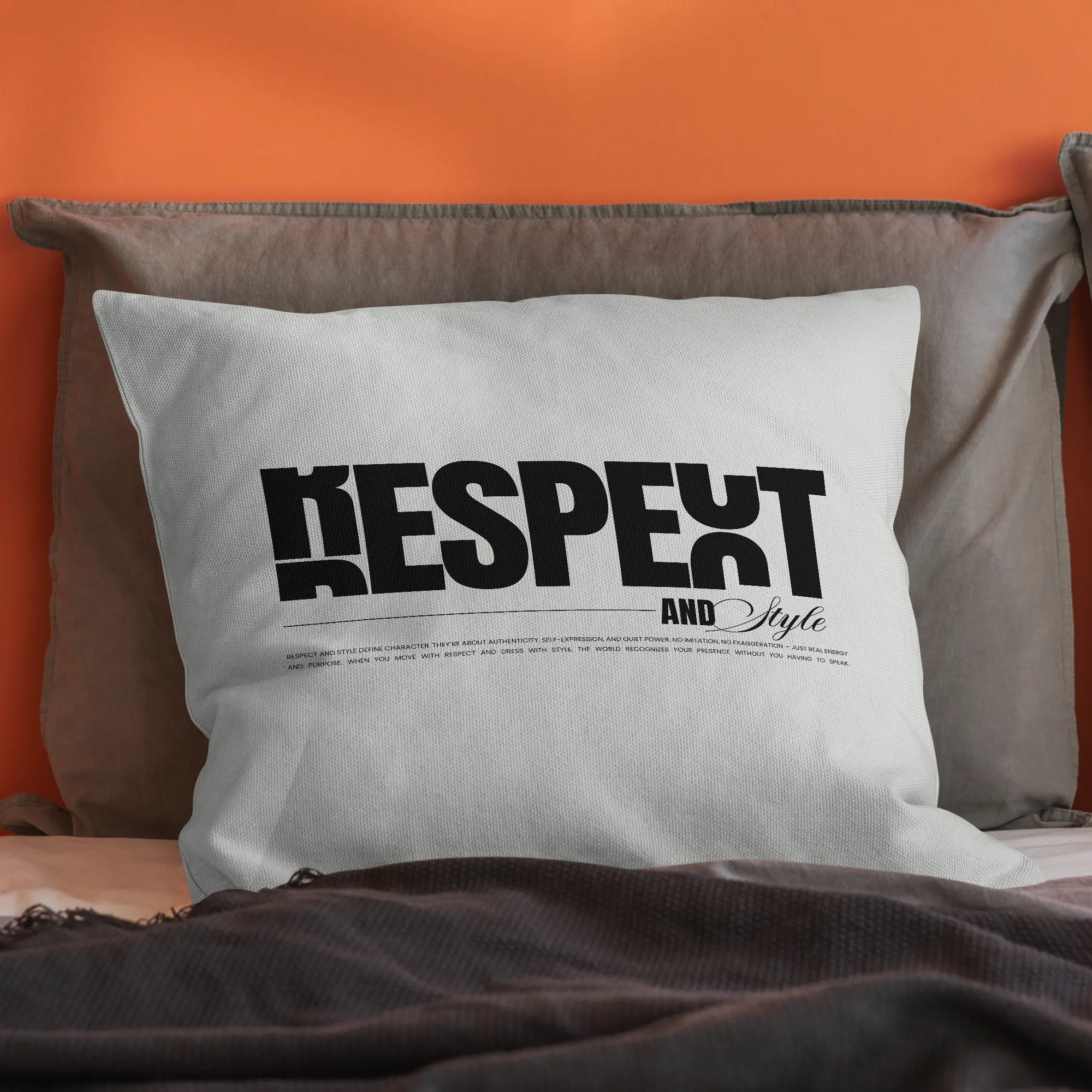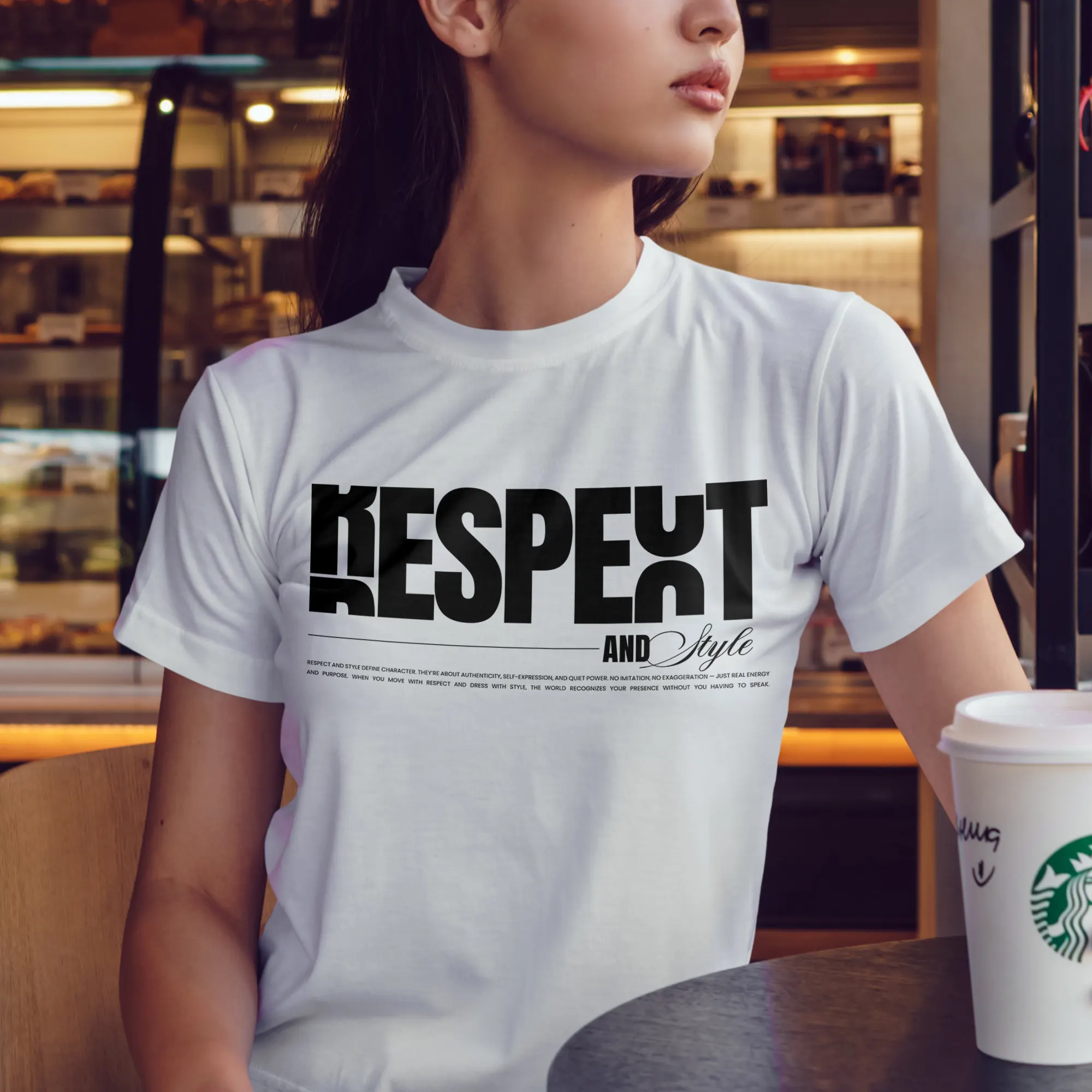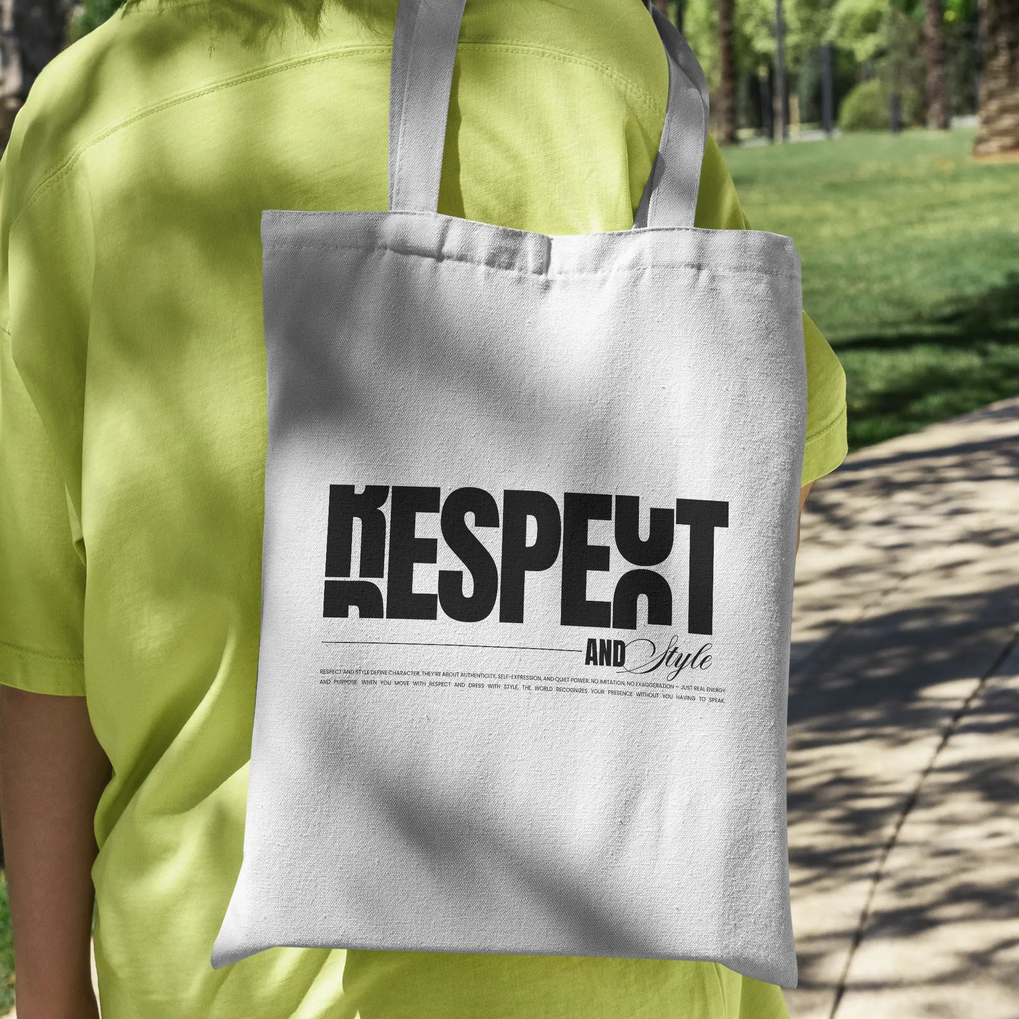 This is a vertical, clean minimalist graphic design centered on the word “RESPECT” with the sub-phrase “AND Style.” The typography is the primary focus, utilizing an extremely bold, extra-condensed, and slightly distorted block font for the word “RESPECT,” dominating the upper half. The sub-phrase uses a mix of clean sans-serif and an elegant script font. The three main colors are Black for all text, a tiny section of Grey/Black for a small photo on the far right (almost entirely cropped), and White for the vast background. The overall style is modern and urban streetwear, relying on high contrast and typographic impact for a professional, statement-making print.