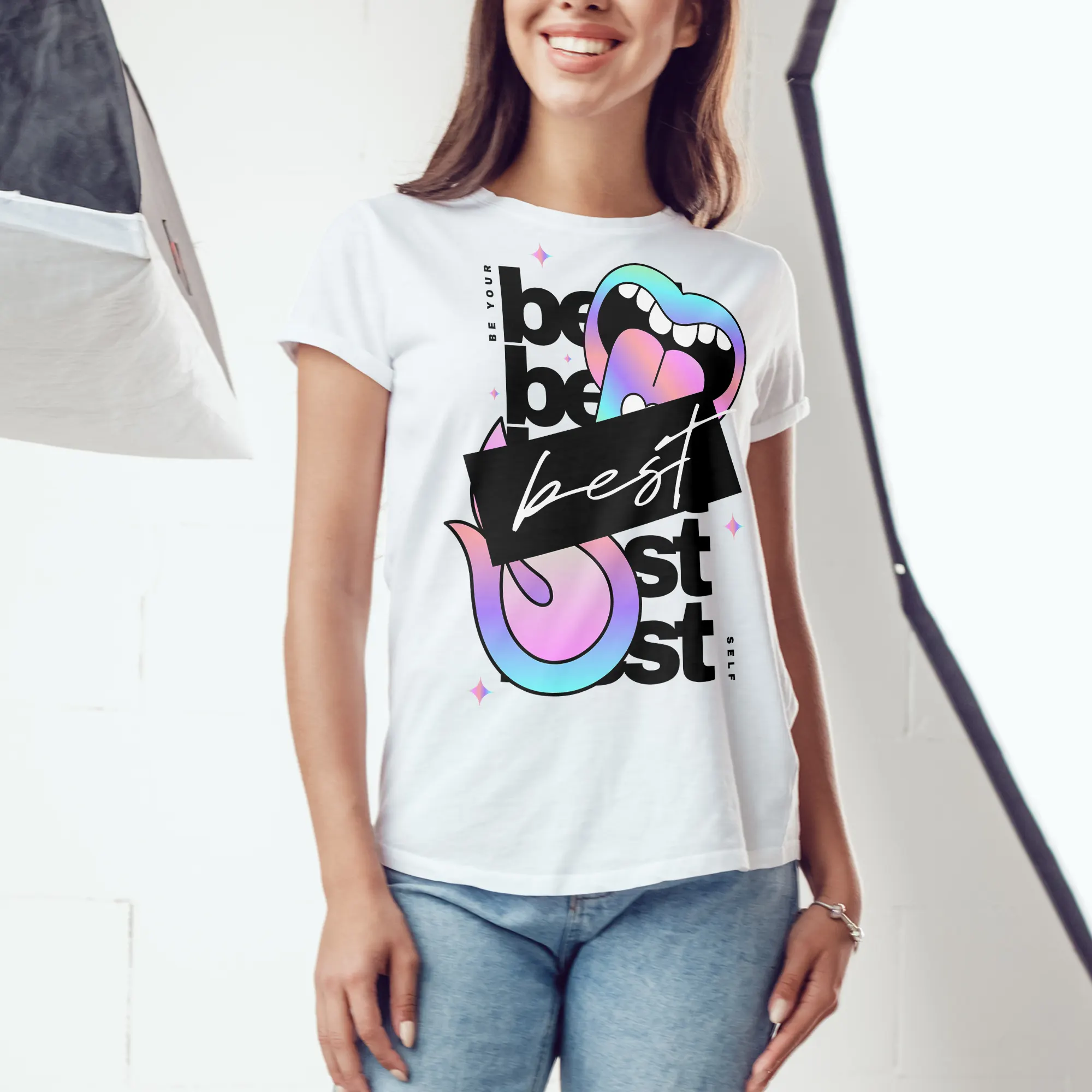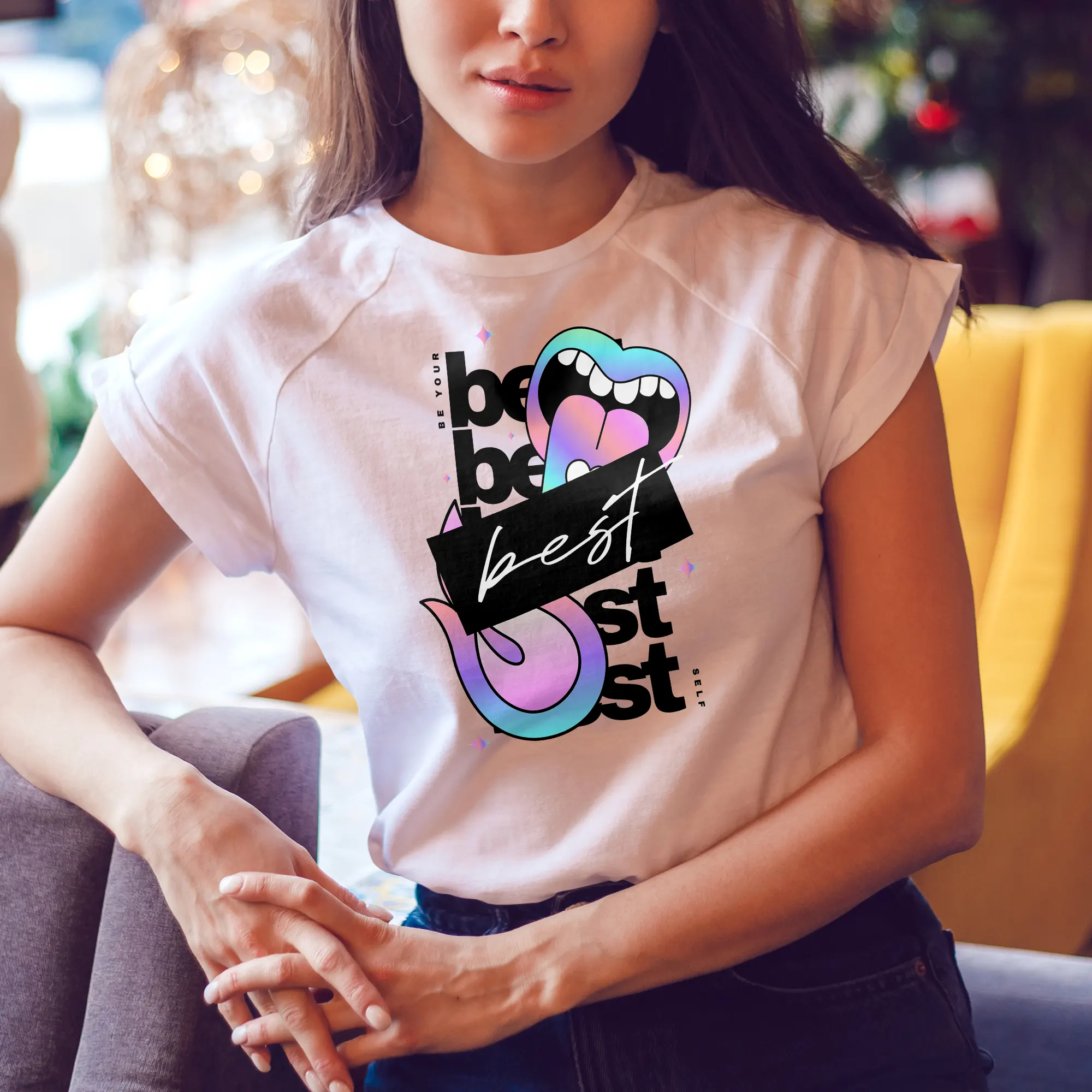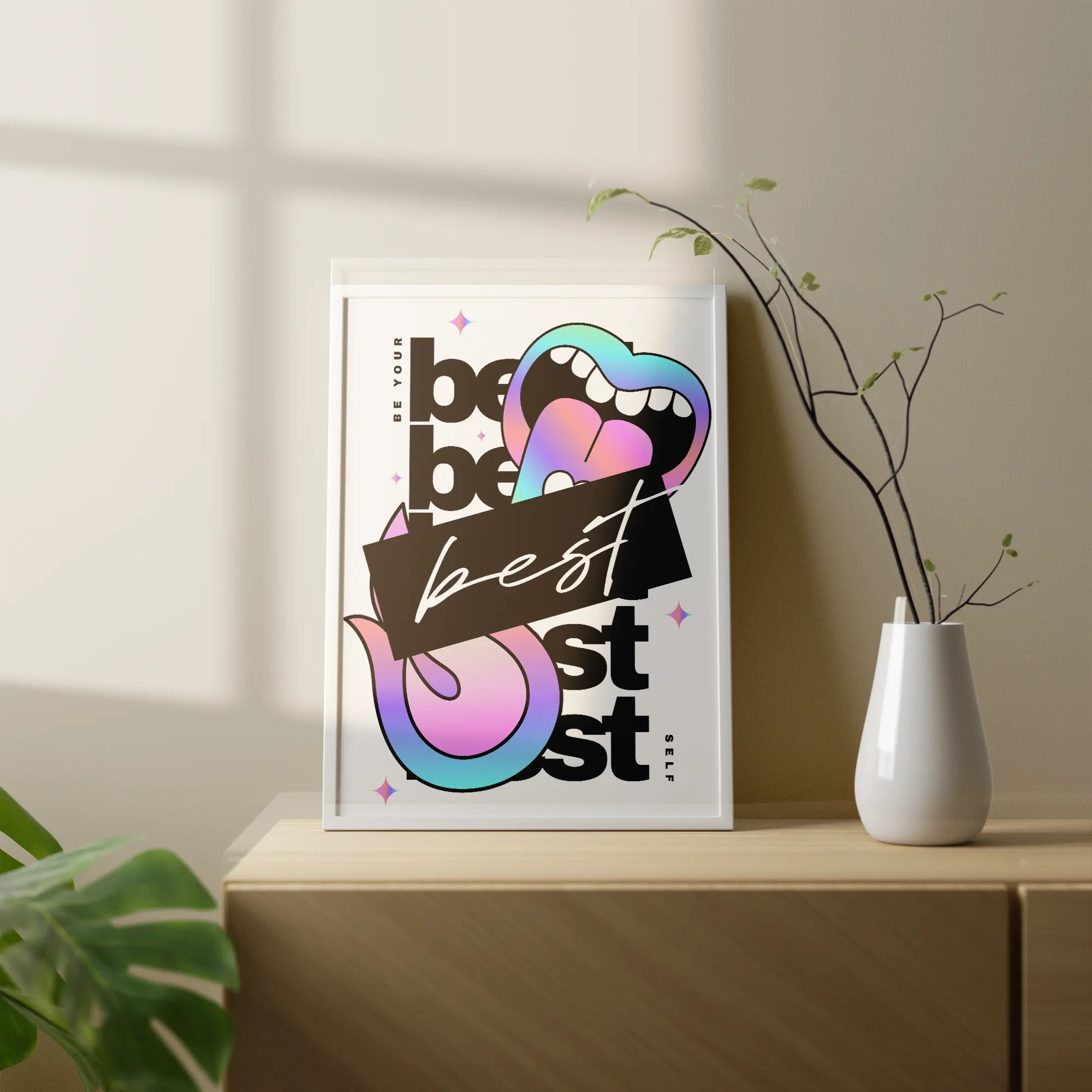 This design is a conceptual and urban style composition with a collage aesthetic that combines a cartoon-style illustration with bold typography and a motivational message. The central piece is a mouth with thick lips that overlaps the letters. The illustration is striking, with a vibrant holographic color gradient that includes shades of blue, pink, and purple. The main typography, which reads “BE YOUR BEST SELF,” is a mix of fonts: “BE YOUR” and “SELF” are sans-serif and arranged vertically, while the word “best” is written in a cursive and calligraphic font, in white on a black background, creating a strong contrast. The design includes decorative elements, such as sparkling four-pointed stars, that reinforce the positive message.