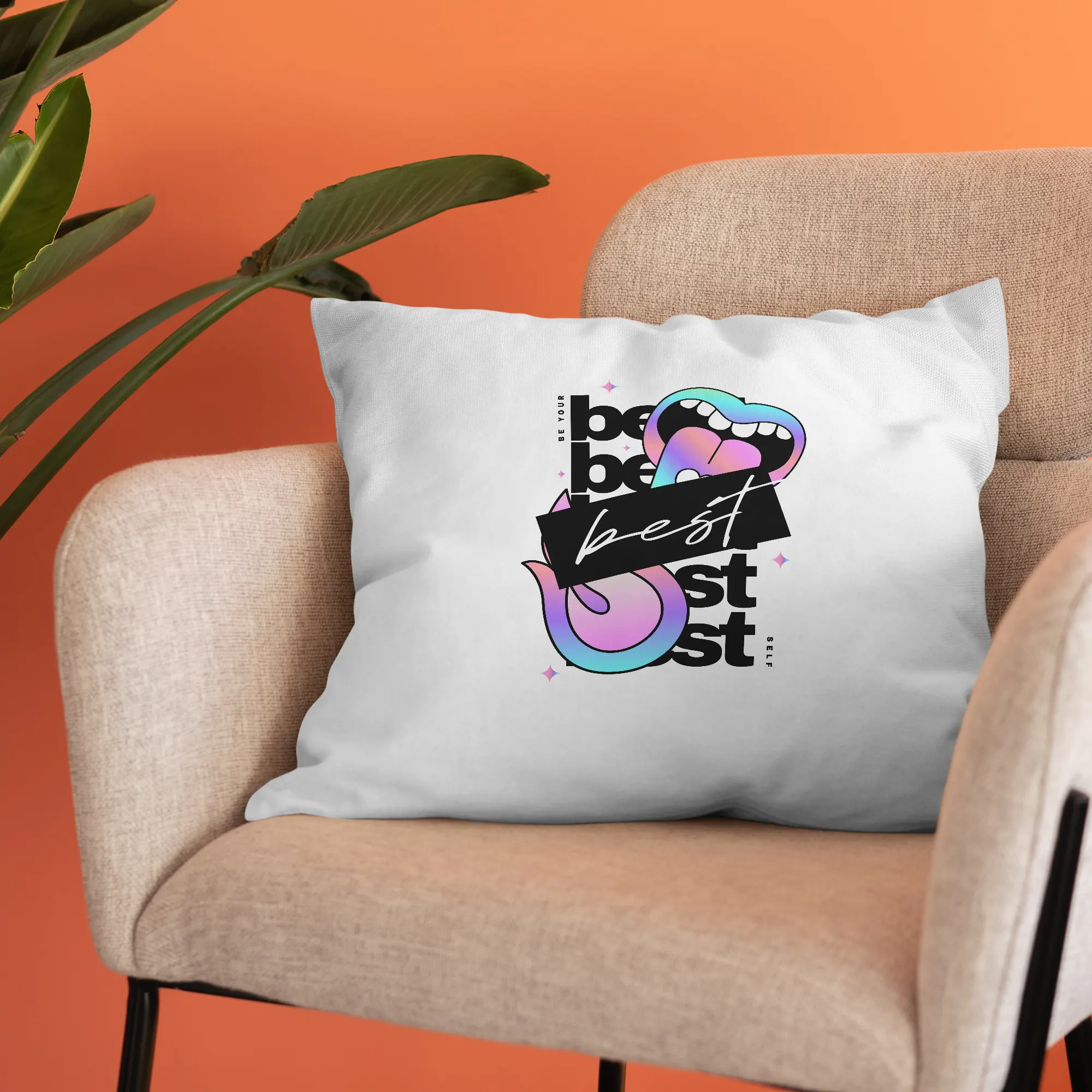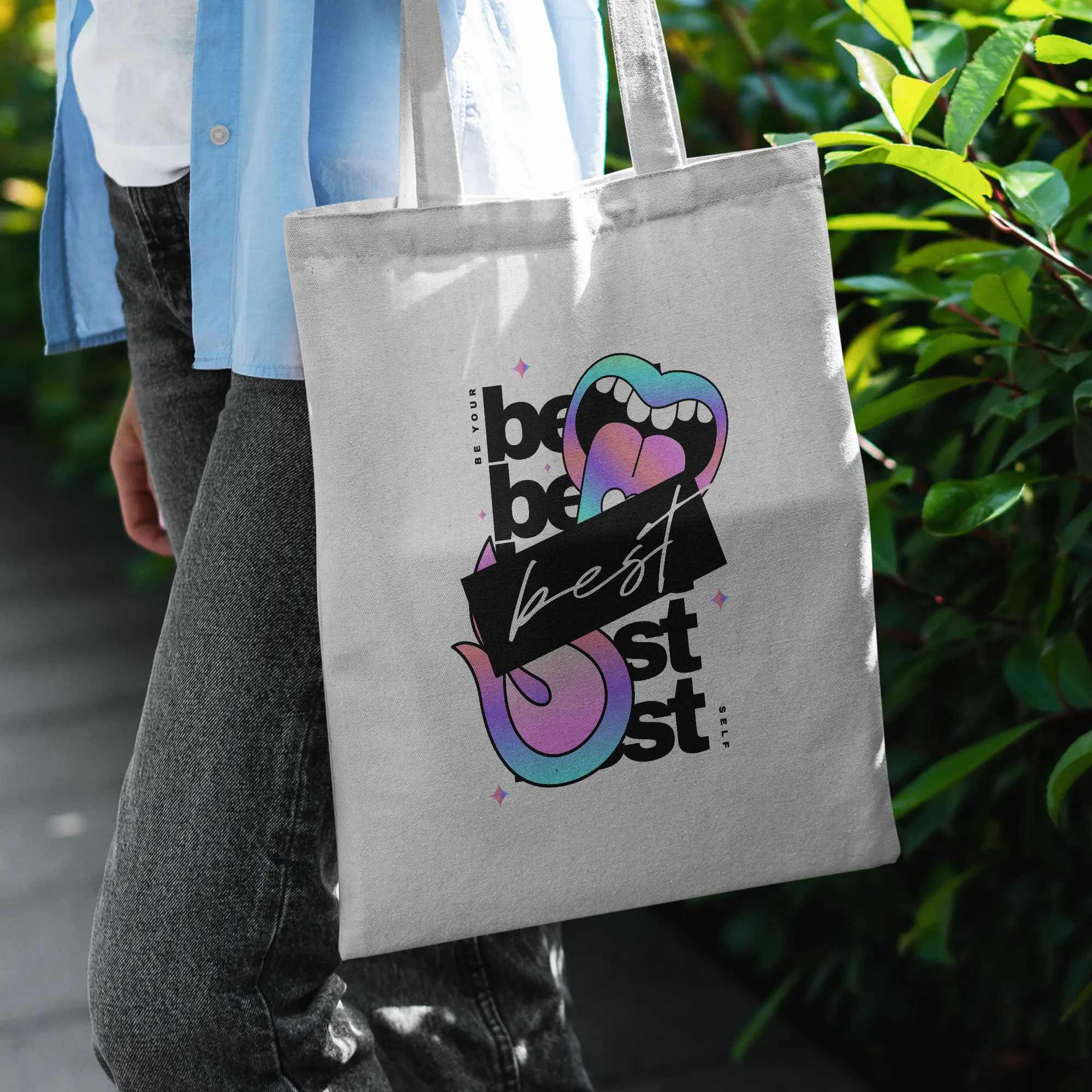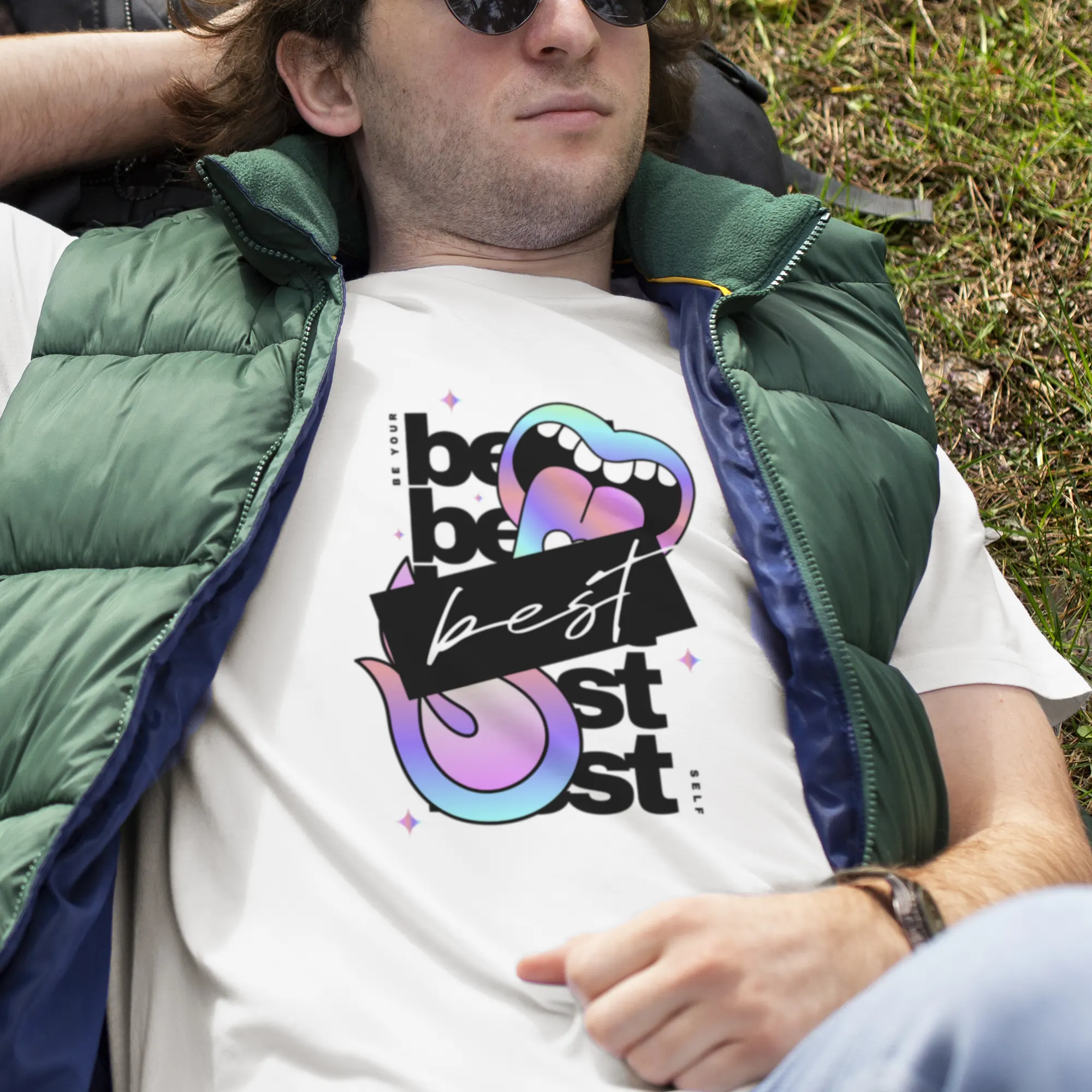 This design is a conceptual and urban style composition with a collage aesthetic that combines a cartoon-style illustration with bold typography and a motivational message. The central piece is a mouth with thick lips that overlaps the letters. The illustration is striking, with a vibrant holographic color gradient that includes shades of blue, pink, and purple. The main typography, which reads “BE YOUR BEST SELF,” is a mix of fonts: “BE YOUR” and “SELF” are sans-serif and arranged vertically, while the word “best” is written in a cursive and calligraphic font, in white on a black background, creating a strong contrast. The design includes decorative elements, such as sparkling four-pointed stars, that reinforce the positive message.