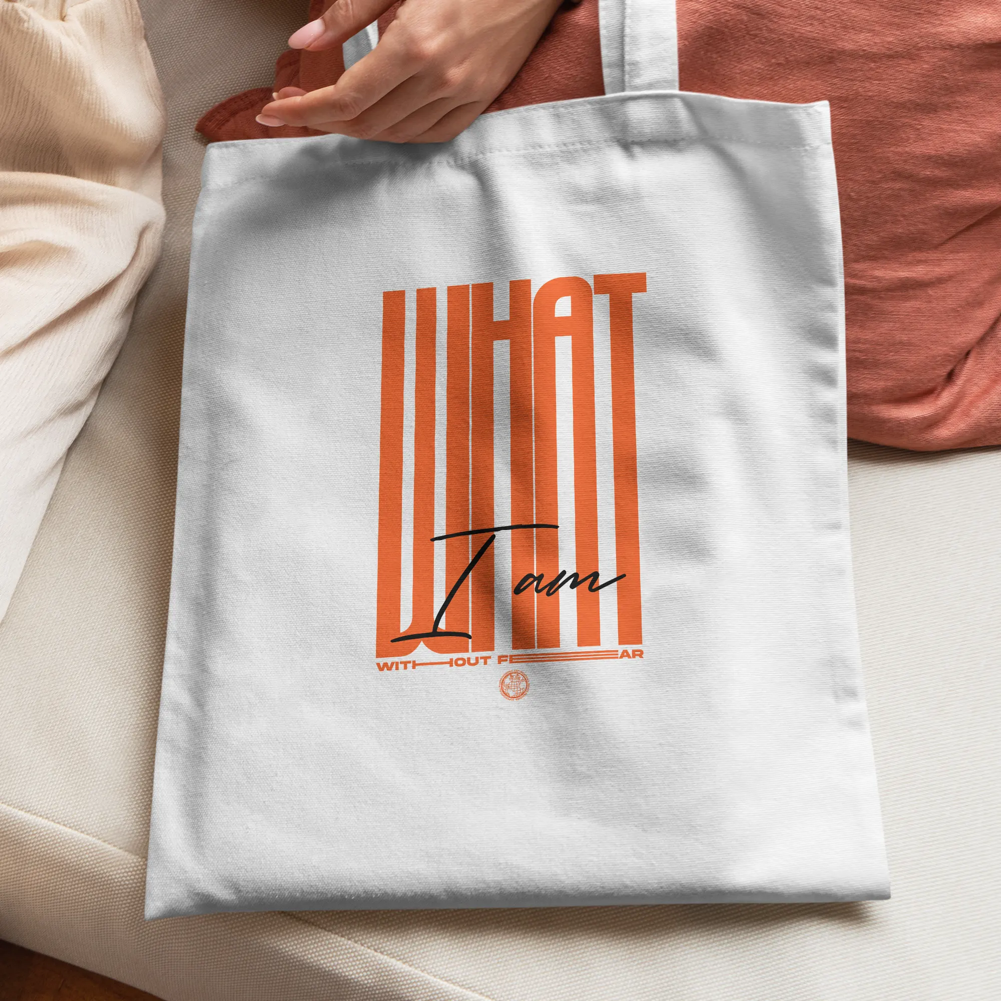 This vertical print design features an oversized, condensed orange headline composed of stacked letters reading as a tall wordmark (interpreted visually as “what i am”), overlaid by a loose handwritten/cursive black signature that articulates “I am”; a narrow decorative wordstrip runs along the bottom. The typography pairs a heavy geometric/condensed display for the background with an informal script for the overlay. The three main colors are vivid orange (primary display type), solid black (handwritten overlay and fine details) and white (background). Visual treatment is flat and graphic—solid fills, tight negative space and layered overlap for contrast—with no gradients or textures. Overall the piece reads as modern, bold and fashion/streetwear-friendly, organized in a strong vertical composition suited for poster or apparel printing.