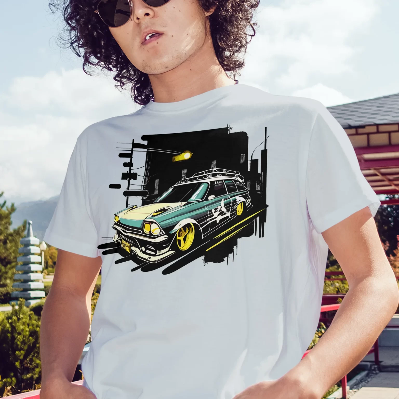 The design features a Japanese car as the main object, set against a stunning backdrop of a sunset and cityscape. The overall style of the design is a blend of anime, artwork, and manga influences, with a graphic Japanese twist.