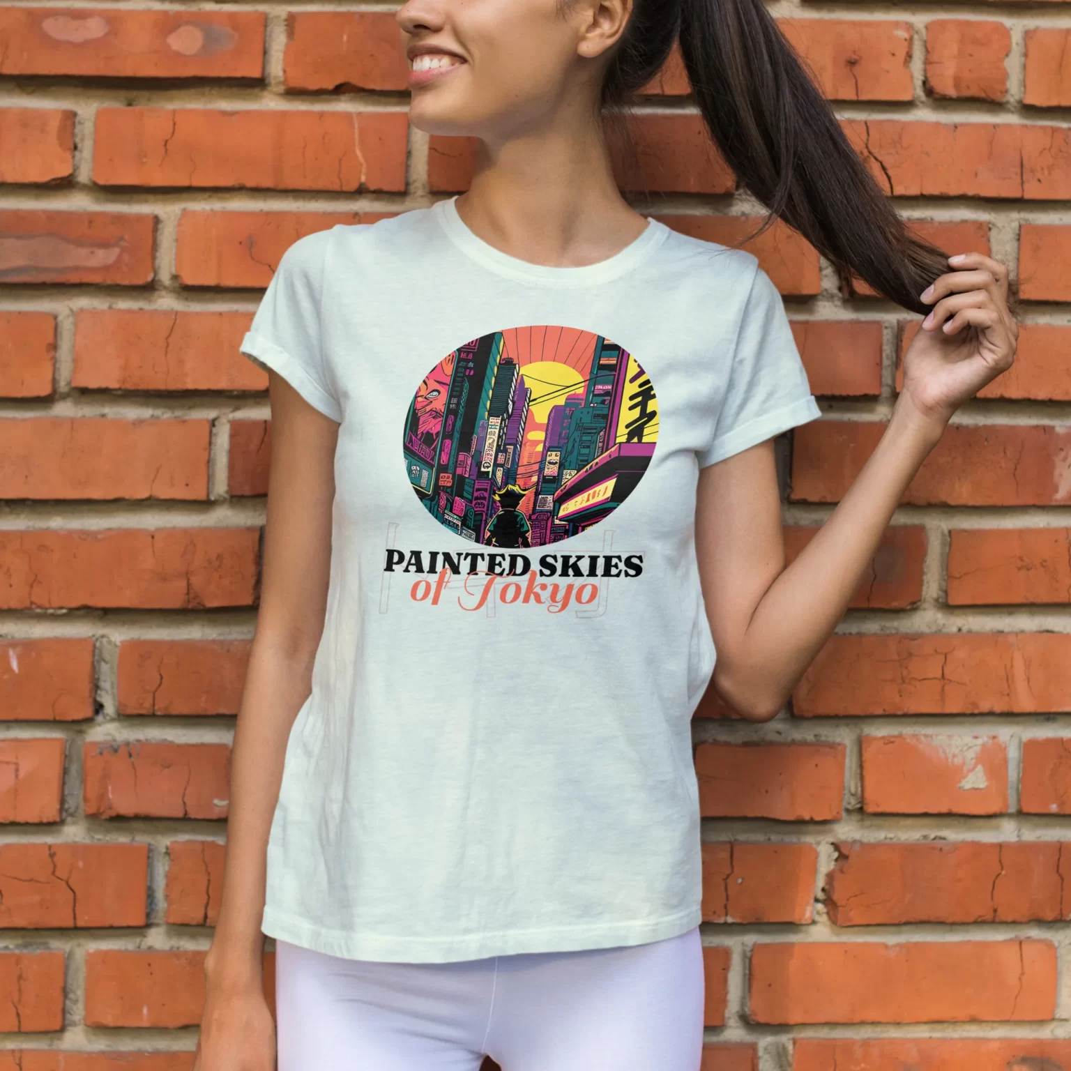 The design features a captivating illustration of a sunrise between buildings in Tokyo. The main object of attention is the impressive sunrise, which serves as the central element of the design. The design style is inspired by anime, manga and Japanese art, creating a visually appealing and vibrant representation.